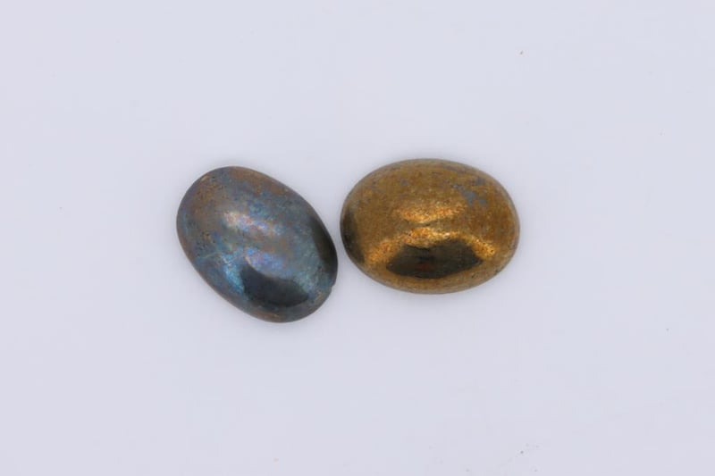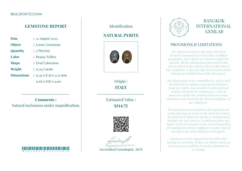 11.24 CARATS CERTIFIED NATURAL PYRITE Gemstone : Natural PyriteCertificate Number : Bigl20230722123436Weight : 11.24 CaratsColor : Brassy YellowMeasurement : 11.45 X 8.36 X 4.31 MmShape : Oval CabochonQuantity : 2 PieceOrigin : ItalyComments : Natural Inclusions Under Magnification.• Use The Qr Code On The Packaging To View And Download The Certificate. • Verify Report Online At Www.Bangkokinternationalgemlab.Co 0+35