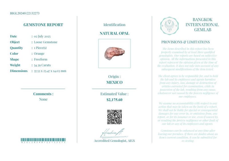 54.39 CARATS CERTIFIED NATURAL OPAL Gemstone : Natural OpalCertificate Number : Bigl20240122132273Weight : 54.39 CaratsColor : OrangeMeasurement : 37.53 X 23.47 X 14.03 MmShape : FreeformQuantity : 1 PieceOrigin : MexicoComments : None• Use The Qr Code On The Packaging To View And Download The Certificate. • Verify Report Online At Www.Bangkokinternationalgemlab.Co 0+38