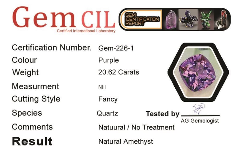 20.62 CARATS NATURAL QUALITY BRAZILIAN AMETHYST 20.62 Carats Natural Quality Brazilian Amethyst 20.62 Carats Natural Quality Brazilian Amethyst Stone = Natural Amethyst Weight = 20.62 Carats Colour = Purple Cut = Fancy Lustre = Excellent Note = Gem Cil, Certified, Precise Custom Cut (Not Commercial) Jewellery Valuations Provided By A Third Party Professional Not Directly Associated With Lloyds Auctions At Aud $20 This Insurance Valuation Has Been Provided By A Registered Jewellery Valuer And Is Intended For Insurance Purposes Only. The Valuation Amount Has No Bearing On The Auction Value Of The Item. Any Questions Regarding The Valuation Should Be Directed To The Issuing Valuer (Refer To Contact Details On The Certificate) As Lloyds Have No Association Or Relationship With The Valuer Or The Valuation Amount Contained Within The Valuation. Condition: Good 645399+1 Valuations Provided by an Independent Third-Party Professional Not Directly Associated With Lloyds Auctions at AUD $20 This valuation has been conducted by an independent third-party professional. The valuation amount is an assessment by the issuing valuer and does not reflect the auction value of the item. Any inquiries regarding the valuation should be directed to the issuing valuer (refer to contact details on the certificate), as Lloyds Auctions has no affiliation or influence over the valuation, the valuer, or the stated amount. Condition: good 0 +1