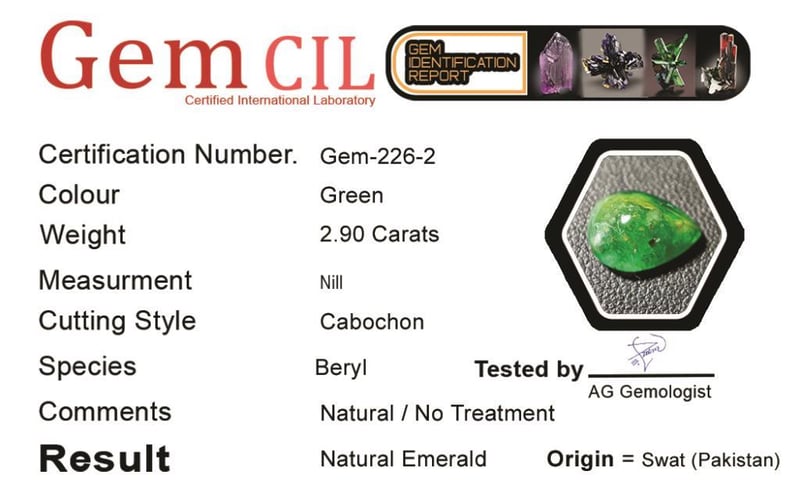 2.90 CARATS NATURAL VIVID GEMMY EMERALD 2.90 Carats Natural Vivid Gemmy Emerald 2.90 Carats Natural Vivid Gemmy EmeraldStone = Natural EmeraldWeight = 2.90 Carats Colour = Green Cut = Cabochon Lustre = Excellent Treatment = No Oil (Natural)Transparency = Transparent Origin = Swat (Pakistan) Note = Rare, Pyrite On Emerald Jewellery Valuations Provided By A Third Party Professional Not Directly Associated With Lloyds Auctions At Aud $20This Insurance Valuation Has Been Provided By A Registered Jewellery Valuer And Is Intended For Insurance Purposes Only. The Valuation Amount Has No Bearing On The Auction Value Of The Item. Any Questions Regarding The Valuation Should Be Directed To The Issuing Valuer (Refer To Contact Details On The Certificate) As Lloyds Have No Association Or Relationship With The Valuer Or The Valuation Amount Contained Within The Valuation.Condition: Good645399+2 Valuations Provided by an Independent Third-Party Professional Not Directly Associated With Lloyds Auctions at AUD $20This valuation has been conducted by an independent third-party professional. The valuation amount is an assessment by the issuing valuer and does not reflect the auction value of the item. Any inquiries regarding the valuation should be directed to the issuing valuer (refer to contact details on the certificate), as Lloyds Auctions has no affiliation or influence over the valuation, the valuer, or the stated amount. Condition: good 0+2
