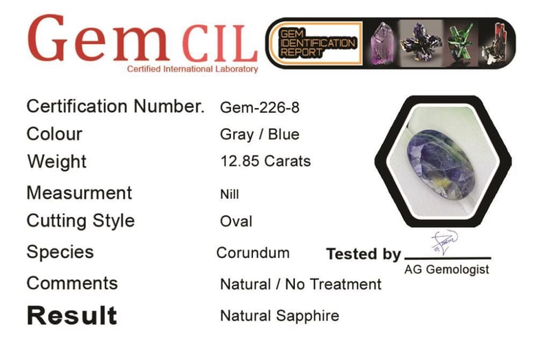 12.85 CARATS NATURAL CERTIFIED SAPPHIRE 12.85 Carats Natural Certified Sapphire 12.85 Carats Natural Certified Sapphire Stone = Natural SapphireWeight = 12.85 Carats Cut = Oval Colour = Gray/BlueLustre = ExcellentTreatment = Natural (No Treatment Detected) Note = Gem Cil, Certified, Precise Custom Cut (Not Commercial) Jewellery Valuations Provided By A Third Party Professional Not Directly Associated With Lloyds Auctions At Aud $20This Insurance Valuation Has Been Provided By A Registered Jewellery Valuer And Is Intended For Insurance Purposes Only. The Valuation Amount Has No Bearing On The Auction Value Of The Item. Any Questions Regarding The Valuation Should Be Directed To The Issuing Valuer (Refer To Contact Details On The Certificate) As Lloyds Have No Association Or Relationship With The Valuer Or The Valuation Amount Contained Within The Valuation.Condition: Good645399+8 Valuations Provided by an Independent Third-Party Professional Not Directly Associated With Lloyds Auctions at AUD $20This valuation has been conducted by an independent third-party professional. The valuation amount is an assessment by the issuing valuer and does not reflect the auction value of the item. Any inquiries regarding the valuation should be directed to the issuing valuer (refer to contact details on the certificate), as Lloyds Auctions has no affiliation or influence over the valuation, the valuer, or the stated amount. Condition: good 0+8