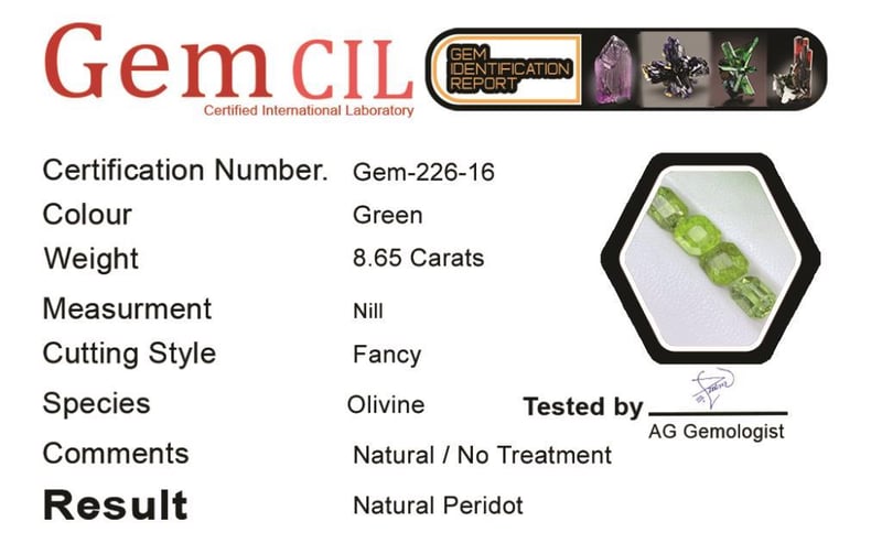 8.65 CARATS NATURAL RARE LOUDGITE PERIDOT 8.65 Carats Natural Rare Loudgite Peridot 8.65 Carats Natural Rare Loudgite PeridotStone = Natural PeridotWeight = 8.65 CaratsColour = Green / BlackCut = Fancy Inclusion = LoudgiteNote = Gem Cil, Certified, Precise Custom Cut (Not Commercial) Jewellery Valuations Provided By A Third Party Professional Not Directly Associated With Lloyds Auctions At Aud $20This Insurance Valuation Has Been Provided By A Registered Jewellery Valuer And Is Intended For Insurance Purposes Only. The Valuation Amount Has No Bearing On The Auction Value Of The Item. Any Questions Regarding The Valuation Should Be Directed To The Issuing Valuer (Refer To Contact Details On The Certificate) As Lloyds Have No Association Or Relationship With The Valuer Or The Valuation Amount Contained Within The Valuation.Condition: Good645399+16 Valuations Provided by an Independent Third-Party Professional Not Directly Associated With Lloyds Auctions at AUD $20This valuation has been conducted by an independent third-party professional. The valuation amount is an assessment by the issuing valuer and does not reflect the auction value of the item. Any inquiries regarding the valuation should be directed to the issuing valuer (refer to contact details on the certificate), as Lloyds Auctions has no affiliation or influence over the valuation, the valuer, or the stated amount. Condition: good 0+16