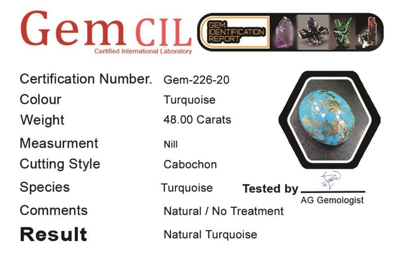 48.00 CARATS NATURAL QUALITY TURQUOISE 48.00 Carats Natural Quality Turquoise 48.00 Carats Natural Quality Turquoise Stone = Natural TurquoiseWeight = 48.00 Carats Cut = Cabochon Colour = TurquoiseQuantity = 1Note = Gem Cil, Certified, Jewellery Valuations Provided By A Third Party Professional Not Directly Associated With Lloyds Auctions At Aud $20This Insurance Valuation Has Been Provided By A Registered Jewellery Valuer And Is Intended For Insurance Purposes Only. The Valuation Amount Has No Bearing On The Auction Value Of The Item. Any Questions Regarding The Valuation Should Be Directed To The Issuing Valuer (Refer To Contact Details On The Certificate) As Lloyds Have No Association Or Relationship With The Valuer Or The Valuation Amount Contained Within The Valuation.Condition: Good645399+20 Valuations Provided by an Independent Third-Party Professional Not Directly Associated With Lloyds Auctions at AUD $20This valuation has been conducted by an independent third-party professional. The valuation amount is an assessment by the issuing valuer and does not reflect the auction value of the item. Any inquiries regarding the valuation should be directed to the issuing valuer (refer to contact details on the certificate), as Lloyds Auctions has no affiliation or influence over the valuation, the valuer, or the stated amount. Condition: good 0+20