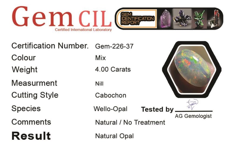 4.00 CARATS NATURAL ELECTRIC FIERY OPAL 4.00 Carats Natural Electric Fiery Opal 4.00 Carats Natural Electric Fiery OpalStone = Natural OpalWeight = 4.00 Carats Cut = Fancy Colour = Play Of Various ColoursCut = Cabochon Treatment = Natural, No TreatmentNote = Picture Taken Under Light Jewellery Valuations Provided By A Third Party Professional Not Directly Associated With Lloyds Auctions At Aud $20This Insurance Valuation Has Been Provided By A Registered Jewellery Valuer And Is Intended For Insurance Purposes Only. The Valuation Amount Has No Bearing On The Auction Value Of The Item. Any Questions Regarding The Valuation Should Be Directed To The Issuing Valuer (Refer To Contact Details On The Certificate) As Lloyds Have No Association Or Relationship With The Valuer Or The Valuation Amount Contained Within The Valuation.Condition: Good645399+37 Valuations Provided by an Independent Third-Party Professional Not Directly Associated With Lloyds Auctions at AUD $20This valuation has been conducted by an independent third-party professional. The valuation amount is an assessment by the issuing valuer and does not reflect the auction value of the item. Any inquiries regarding the valuation should be directed to the issuing valuer (refer to contact details on the certificate), as Lloyds Auctions has no affiliation or influence over the valuation, the valuer, or the stated amount. Condition: good 0+37