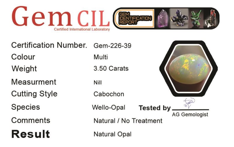 3.50 CARATS NATURAL ELECTRIC FIERY OPAL 3.50 Carats Natural Electric Fiery Opal 3.50 Carats Natural Electric Fiery OpalStone = Natural OpalWeight = 3.50 Carats Cut = Fancy Colour = Play Of Various ColoursCut = Cabochon Treatment = Natural, No TreatmentNote = Picture Taken Under Light Jewellery Valuations Provided By A Third Party Professional Not Directly Associated With Lloyds Auctions At Aud $20This Insurance Valuation Has Been Provided By A Registered Jewellery Valuer And Is Intended For Insurance Purposes Only. The Valuation Amount Has No Bearing On The Auction Value Of The Item. Any Questions Regarding The Valuation Should Be Directed To The Issuing Valuer (Refer To Contact Details On The Certificate) As Lloyds Have No Association Or Relationship With The Valuer Or The Valuation Amount Contained Within The Valuation.Condition: Good645399+39 Valuations Provided by an Independent Third-Party Professional Not Directly Associated With Lloyds Auctions at AUD $20This valuation has been conducted by an independent third-party professional. The valuation amount is an assessment by the issuing valuer and does not reflect the auction value of the item. Any inquiries regarding the valuation should be directed to the issuing valuer (refer to contact details on the certificate), as Lloyds Auctions has no affiliation or influence over the valuation, the valuer, or the stated amount. Condition: good 0+39