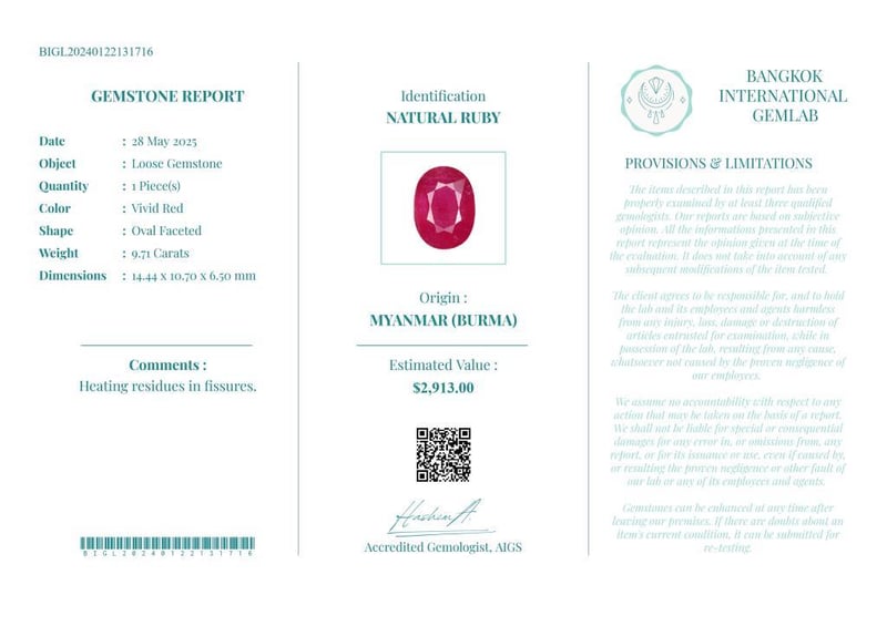 9.71 CARATS CERTIFIED NATURAL RUBY Gemstone : Natural RubyCertificate Number : Bigl20240122131716Weight : 9.71 CaratsColor : Vivid RedMeasurement : 14.44 X 10.70 X 6.50 MmShape : Oval FacetedQuantity : 1 PieceOrigin : Myanmar (Burma)Comments : Heating Residues In Fissures.• Use The Qr Code On The Packaging To View And Download The Certificate. • Verify Report Online At Www.Bangkokinternationalgemlab.Co 0+1