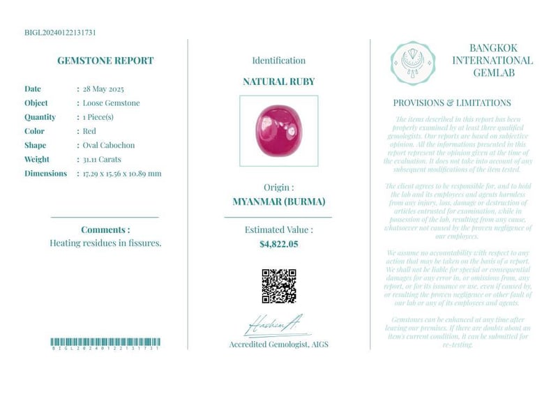 31.11 CARATS CERTIFIED NATURAL RUBY Gemstone : Natural RubyCertificate Number : Bigl20240122131731Weight : 31.11 CaratsColor : RedMeasurement : 17.29 X 15.56 X 10.89 MmShape : Oval CabochonQuantity : 1 PieceOrigin : Myanmar (Burma)Comments : Heating Residues In Fissures.• Use The Qr Code On The Packaging To View And Download The Certificate. • Verify Report Online At Www.Bangkokinternationalgemlab.Co 0+2