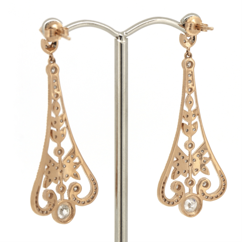 14K ROSE GOLD AND DIAMOND, CHANDELIER EARRINGS. THE DROPS FEATURE, 102 ROUND BRILLIANT CUT, DIAMONDS (1.38CT TDW, H-K COLOUR, P2+ CLARITY), BEAD SET WITH MILLEGRAIN DETAIL. THE EARRINGS HAVE POST BACKS, WITH 14K ROSE GOLD BUTTERFLY CLASPS.