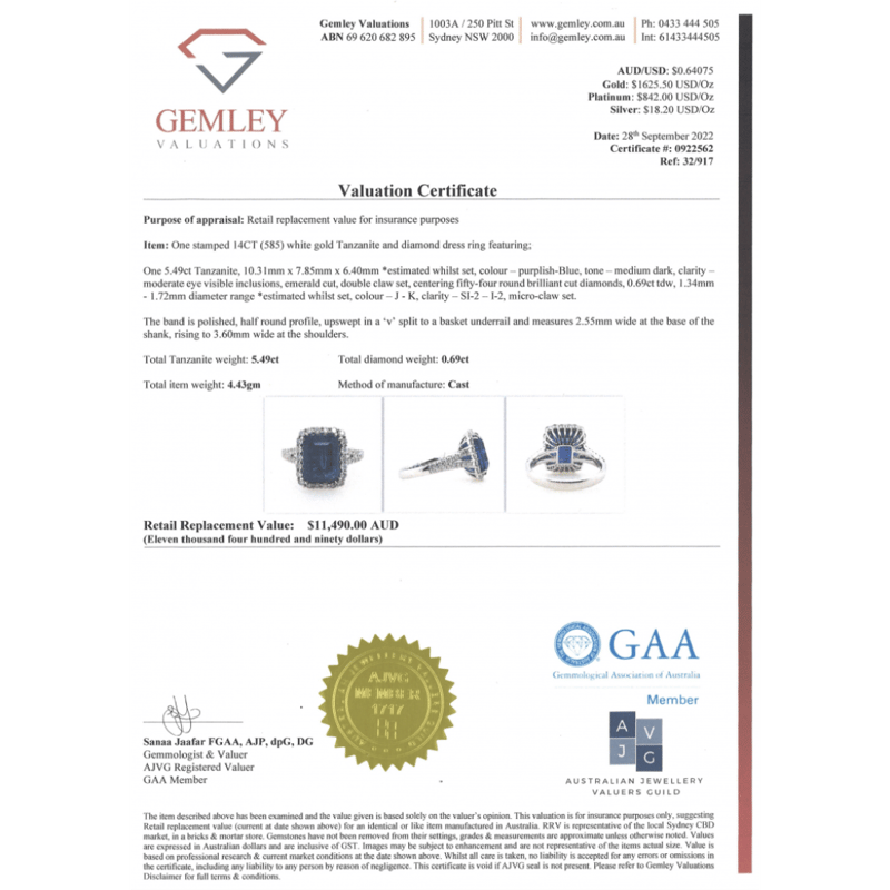 14K WHITE GOLD, TANZANITE AND DIAMOND, HALO SPLIT BAND RING. THE CENTRE FEATURES, ONE EMERALD CUT, MEDIUM DARK PURPLISH-BLUE, TANZANITE (5.49CT, MODERATE EYE VISIBLE INCLUSIONS), DOUBLE CLAW SET. SURROUNDING THE CENTRE IN A HALO AND DECORATING THE BAND ARE, 54 ROUND BRILLIANT CUT, DIAMONDS (0.69CT TDW, J-K COLOUR, SI2-I2 CLARITY), MICRO-CLAW SET. RING SIZE M.THE TANZANITE HAS SOME NATURAL INCLUSIONS THAT HAVE REACHED THE SURFACE. Jewellery Valuations Provided By A Third Party Professional Not Directly Associated With Lloyds Auctions at AUD $11,490.00This Insurance Valuation has been provided by a registered Jewellery Valuer and is intended for insurance purposes only. The valuation amount has no bearing on the auction value of the item. Any questions regarding the valuation should be directed to the issuing Valuer (refer to contact details on the certificate) as Lloyds have no association or relationship with the Valuer or the valuation amount contained within the valuation. Condition: Good - Refer Images 0645856+1644