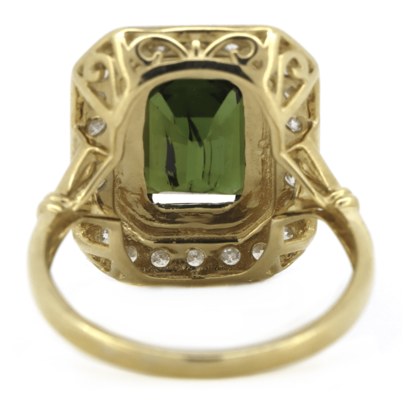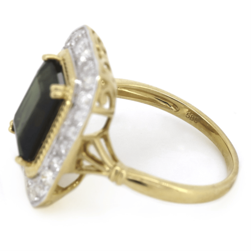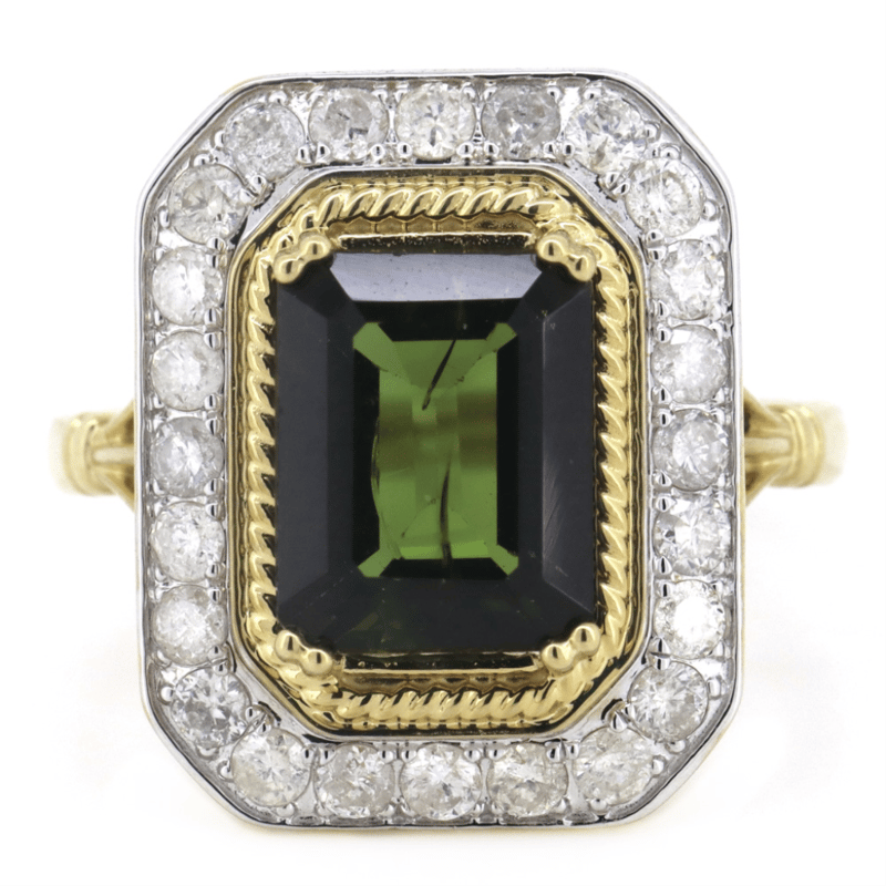 14K YELLOW GOLD, GREEN TOURMALINE AND DIAMOND, ANTIQUE INSPIRED RING. THE CENTRE FEATURES, ONE EMERALD CUT, MEDIUM-DARK BROWNISH-GREEN, TOURMALINE (3.32CT, MINOR EYE VISIBLE INCLUSIONS), DOUBLE CLAW SET. SURROUNDING THE CENTRE IN A HALO ARE, 24 ROUND BRILLIANT CUT, DIAMONDS (0.80CT TDW, H-J COLOUR, SI2-I2 CLARITY), BEAD SET IN WHITE GOLD. RING SIZE P. Jewellery Valuations Provided By A Third Party Professional Not Directly Associated With Lloyds Auctions at AUD $9,890.00This Insurance Valuation has been provided by a registered Jewellery Valuer and is intended for insurance purposes only. The valuation amount has no bearing on the auction value of the item. Any questions regarding the valuation should be directed to the issuing Valuer (refer to contact details on the certificate) as Lloyds have no association or relationship with the Valuer or the valuation amount contained within the valuation. Condition: Good - Refer Images 0645856+1653