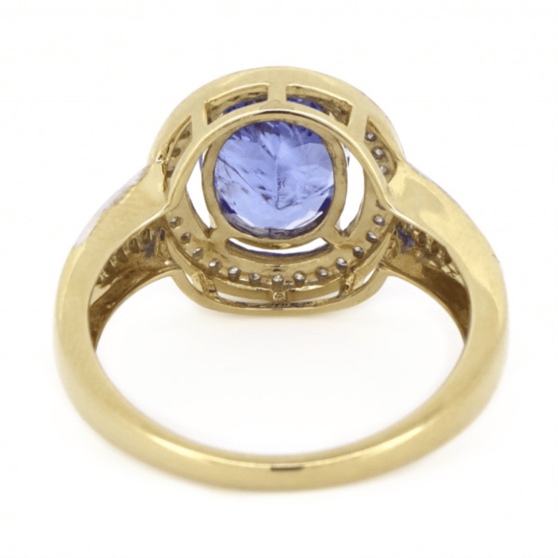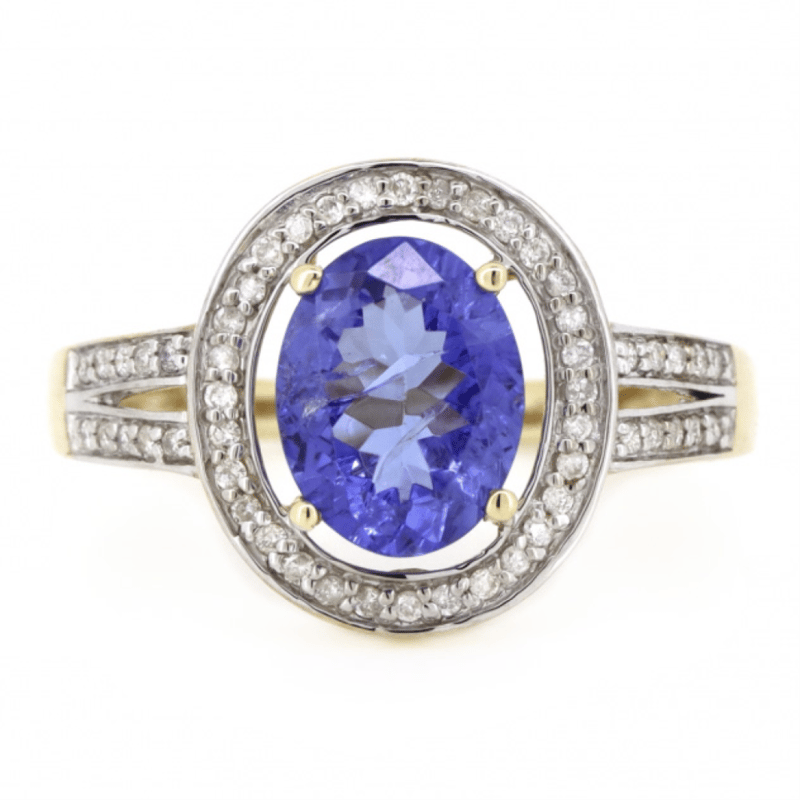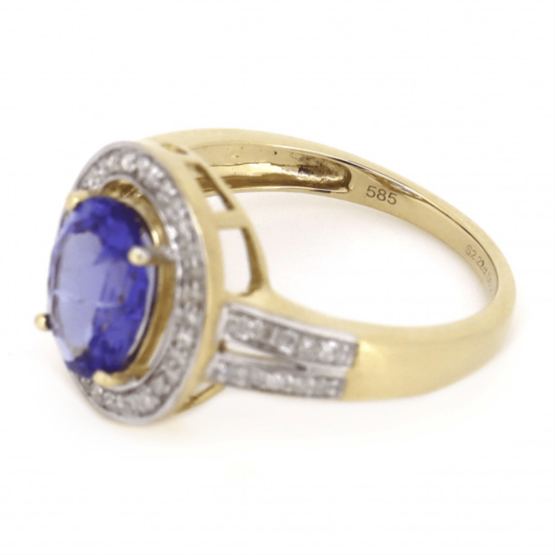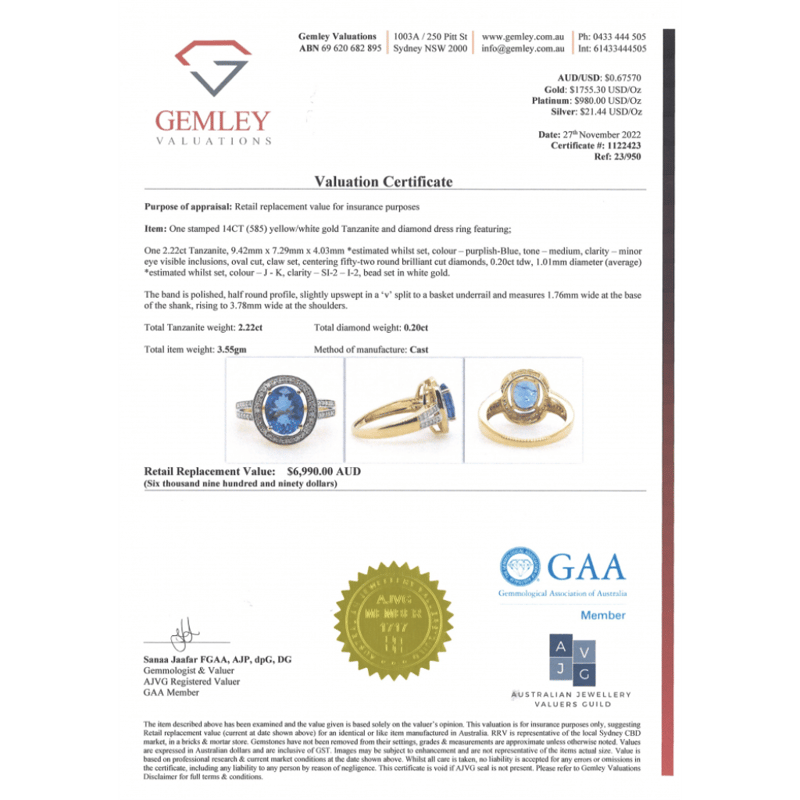 14K YELLOW GOLD, TANZANITE AND DIAMOND, SPLIT BAND HALO RING. THE CENTRE FEATURES, ONE OVAL CUT, MEDIUM PURPLISH-BLUE, TANZANITE (2.22CT, MINOR EYE VISIBLE INCLUSIONS), 4 CLAW SET. SURROUNDING THE CENTRE IN A HALO AND DECORATING THE SPLIT BAND ARE, 52 ROUND BRILLIANT CUT, DIAMONDS (0.20CT TDW, J-K COLOUR, SI2-I2 CLARITY), BEAD SET IN WHITE GOLD. RING SIZE O. Jewellery Valuations Provided By A Third Party Professional Not Directly Associated With Lloyds Auctions at AUD $6,990.00This Insurance Valuation has been provided by a registered Jewellery Valuer and is intended for insurance purposes only. The valuation amount has no bearing on the auction value of the item. Any questions regarding the valuation should be directed to the issuing Valuer (refer to contact details on the certificate) as Lloyds have no association or relationship with the Valuer or the valuation amount contained within the valuation. Condition: Good - Refer Images 0645856+1636