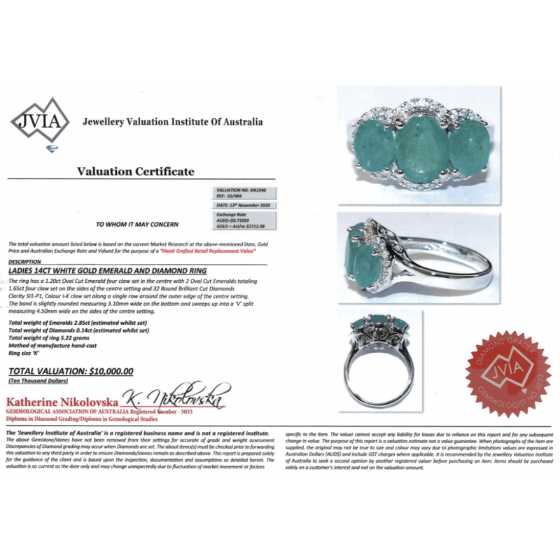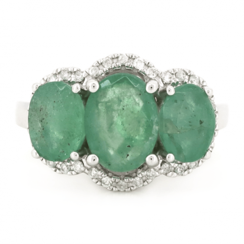 14K WHITE GOLD, EMERALD AND DIAMOND, HALO TRILOGY RING. THE DESIGN FEATURES, 3 OVAL CUT, GREEN, EMERALDS (2.85CT TSW, VISIBLE INCLUSIONS), CLAW SET. ENCOMPASSING THE DESIGN ARE, 32 ROUND BRILLIANT CUT, DIAMONDS (0.14CT TDW, I-K COLOUR, SI1-P1 CLARITY), CLAW SET. RING SIZE J 1/2. Jewellery Valuations Provided By A Third Party Professional Not Directly Associated With Lloyds Auctions at AUD $10,000.00This Insurance Valuation has been provided by a registered Jewellery Valuer and is intended for insurance purposes only. The valuation amount has no bearing on the auction value of the item. Any questions regarding the valuation should be directed to the issuing Valuer (refer to contact details on the certificate) as Lloyds have no association or relationship with the Valuer or the valuation amount contained within the valuation. Condition: Good - Refer Images 0645856+1651