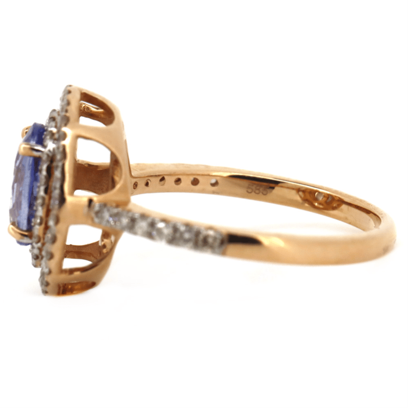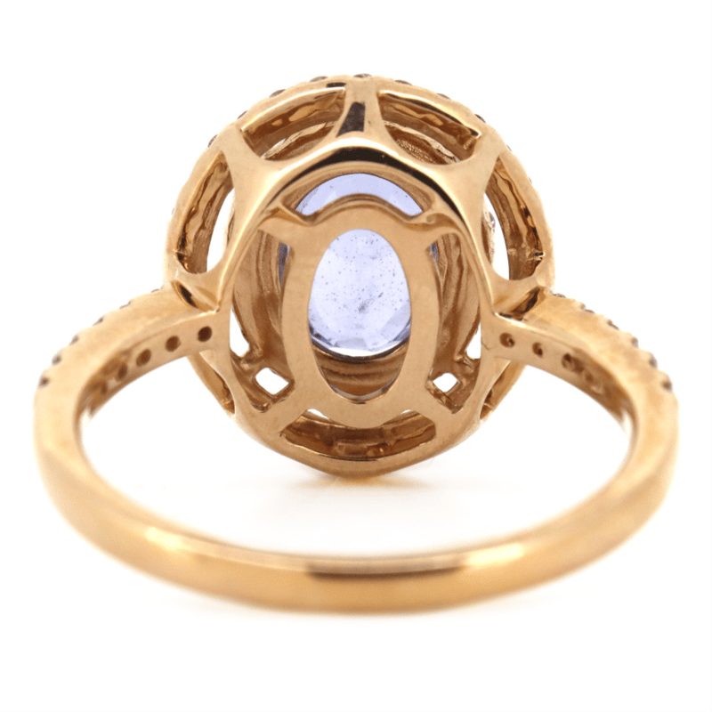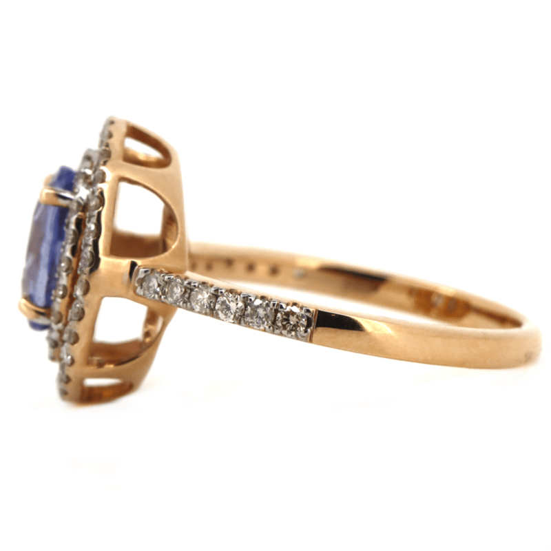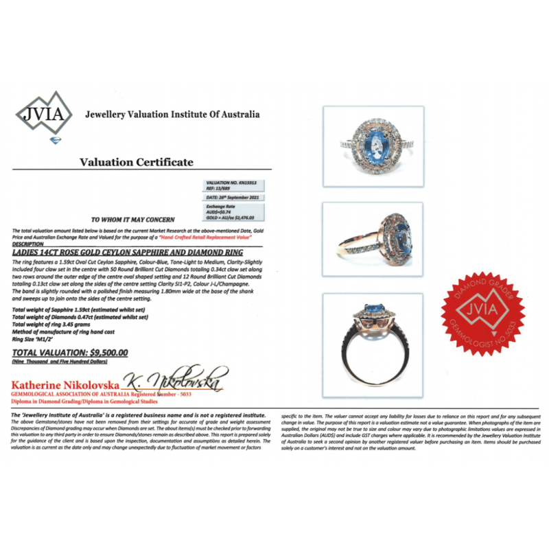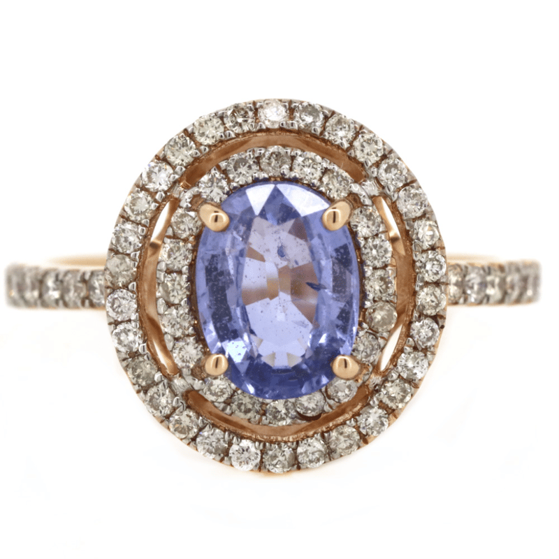 14K ROSE GOLD, 1.59CT BLUE CEYLON SAPPHIRE AND DIAMOND, DOUBLE HALO RING. THE CENTRE FEATURES, ONE OVAL CUT, LIGHT-MEDIUM BLUE, CEYLON SAPPHIRE (1.59CT, SLIGHTLY INCLUDED), CLAW SET. SURROUNDING THE CENTRE IN A DOUBLE HALO AND DECORATING THE BAND ARE, 62 ROUND BRILLIANT CUT, CHAMPAGNE, DIAMONDS (0.47CT TDW, J-L COLOUR, SI1-P2 CLARITY), CLAW SET. RING SIZE N.
