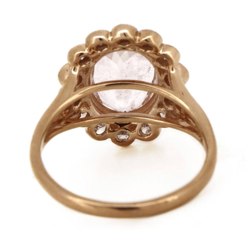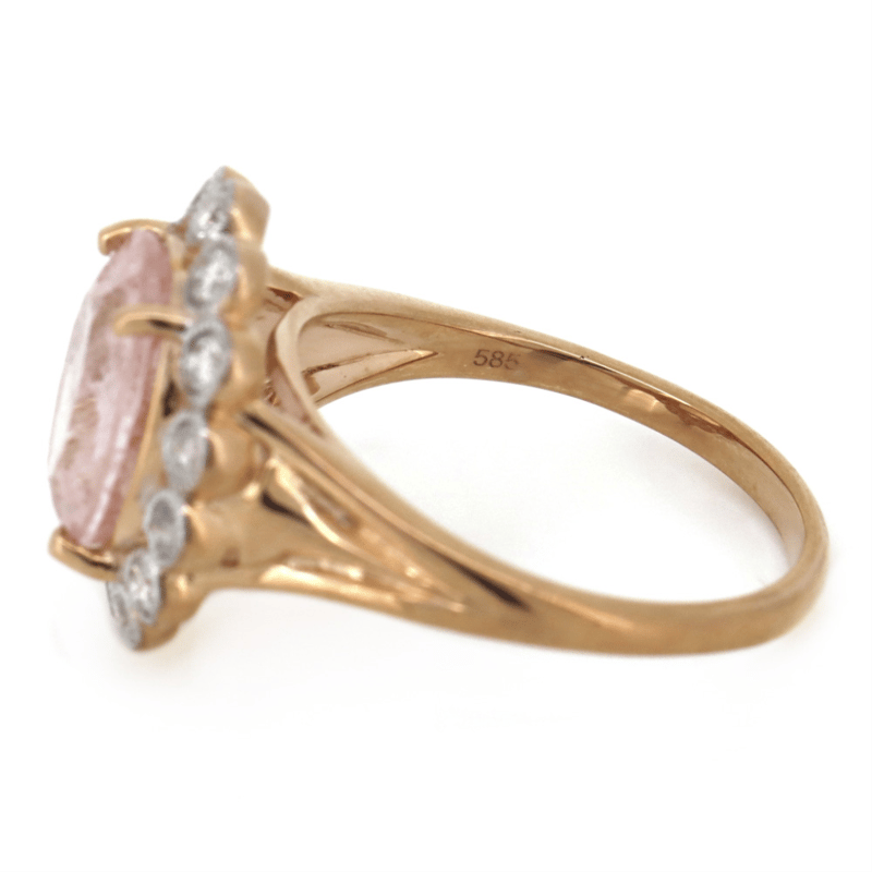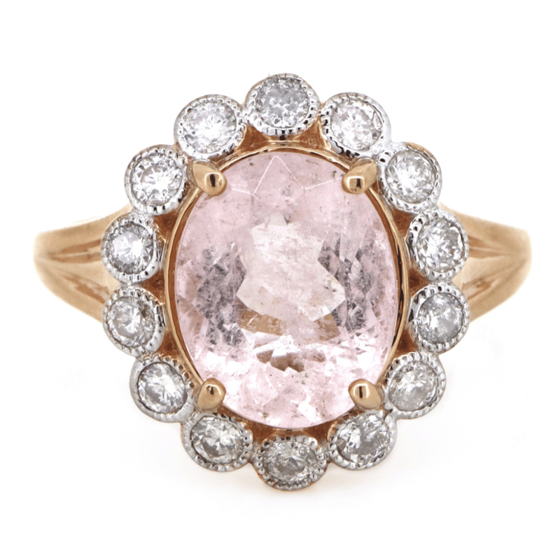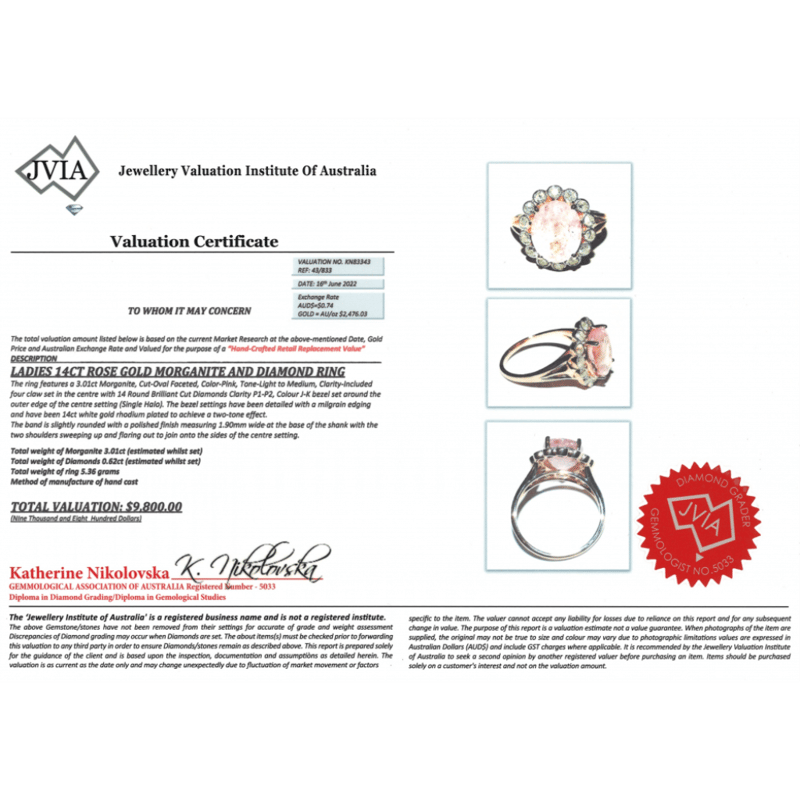 14K ROSE GOLD, MORGANITE AND DIAMOND, HALO RING. THE CENTRE FEATURES, ONE OVAL FACETED CUT, LIGHT-MEDIUM PINK, MORGANITE (3.01CT, INCLUDED), 4 CLAW SET. SURROUNDING THE CENTRE IN A SCALLOPED HALO DESIGN ARE, 14 ROUND BRILLIANT CUT, DIAMONDS (0.62CT TDW, J-K COLOUR, P1-P2 CLARITY), BEZEL SET WITH MILLEGRAIN DETAIL. THE BEZEL SETTING HAS BEEN 14K WHITE GOLD RHODIUM PLATED, TO ACHIEVE A TWO-TONE EFFECT. RING SIZE P 1/2. Jewellery Valuations Provided By A Third Party Professional Not Directly Associated With Lloyds Auctions at AUD $9,800.00This Insurance Valuation has been provided by a registered Jewellery Valuer and is intended for insurance purposes only. The valuation amount has no bearing on the auction value of the item. Any questions regarding the valuation should be directed to the issuing Valuer (refer to contact details on the certificate) as Lloyds have no association or relationship with the Valuer or the valuation amount contained within the valuation. Condition: Good - Refer Images 0645856+1640