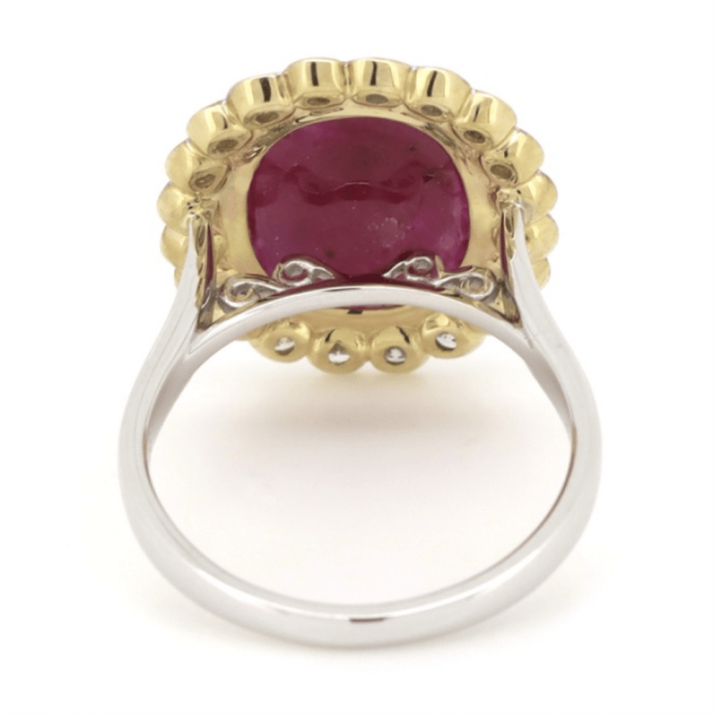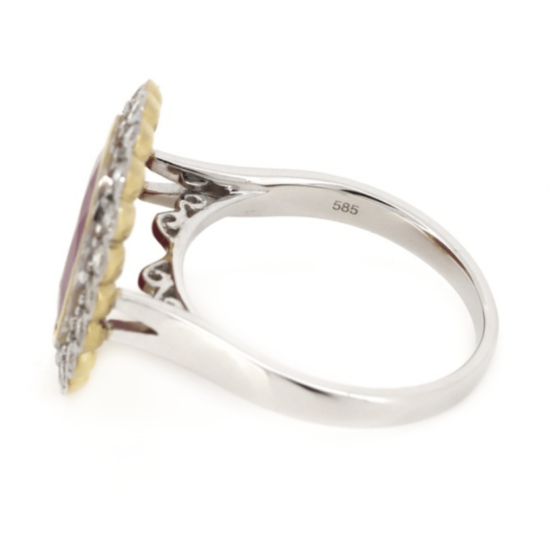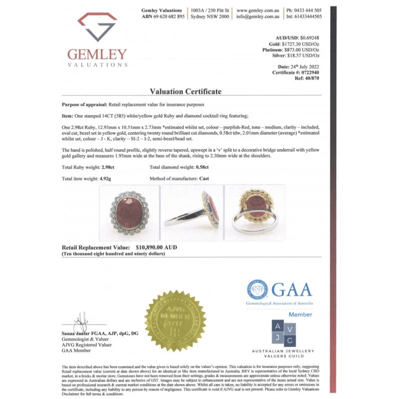 14K WHITE/YELLOW GOLD, RUBY AND DIAMOND, HALO RING. THE CENTRE FEATURES, ONE OVAL CUT, MEDIUM PURPLISH-RED, RUBY (2.98CT, INCLUDED), BEZEL SET IN YELLOW GOLD. SURROUNDING THE CENTRE IN A HALO ARE, 20 ROUND BRILLIANT CUT, DIAMONDS (0.58CT TDW, J-K COLOUR, SI2-I2 CLARITY), SEMI-BEZEL/BEAD SET. RING SIZE M 1/2. Jewellery Valuations Provided By A Third Party Professional Not Directly Associated With Lloyds Auctions at AUD $10,890.00This Insurance Valuation has been provided by a registered Jewellery Valuer and is intended for insurance purposes only. The valuation amount has no bearing on the auction value of the item. Any questions regarding the valuation should be directed to the issuing Valuer (refer to contact details on the certificate) as Lloyds have no association or relationship with the Valuer or the valuation amount contained within the valuation. Condition: Good - Refer Images 0645856+1637