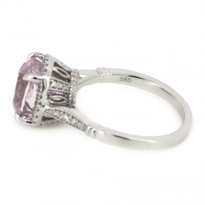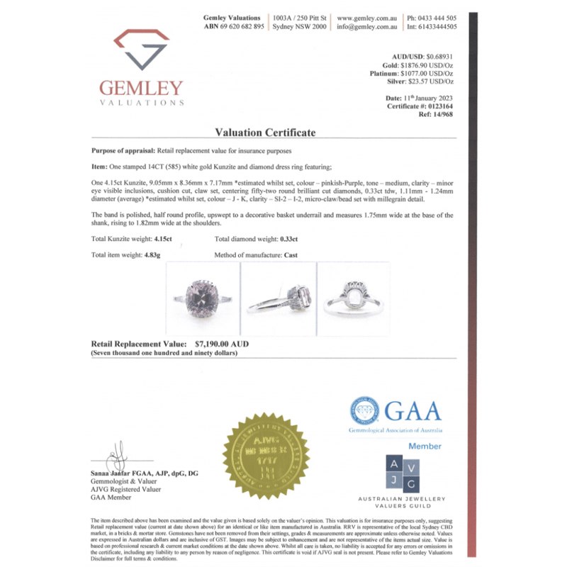 14K WHITE GOLD, KUNZITE AND DIAMOND, HALO RING. THE CENTRE FEATURES, ONE CUSHION CUT, PINKISH-PURPLE, KUNZITE (4.15CT, MINOR EYE VISIBLE INCLUSIONS), 4 CLAW SET. SURROUNDING THE CENTRE IN A HALO AND DECORATING THE BAND ARE, 52 ROUND BRILLIANT CUT, DIAMONDS (0.33CT TDW, J-K COLOUR, SI2-I2 CLARITY), MICRO-CLAW/BEAD SET WITH MILLEGRAIN DETAIL. RING SIZE N. Jewellery Valuations Provided By A Third Party Professional Not Directly Associated With Lloyds Auctions at AUD $7,190.00This Insurance Valuation has been provided by a registered Jewellery Valuer and is intended for insurance purposes only. The valuation amount has no bearing on the auction value of the item. Any questions regarding the valuation should be directed to the issuing Valuer (refer to contact details on the certificate) as Lloyds have no association or relationship with the Valuer or the valuation amount contained within the valuation. Condition: Good - Refer Images 0645856+1685