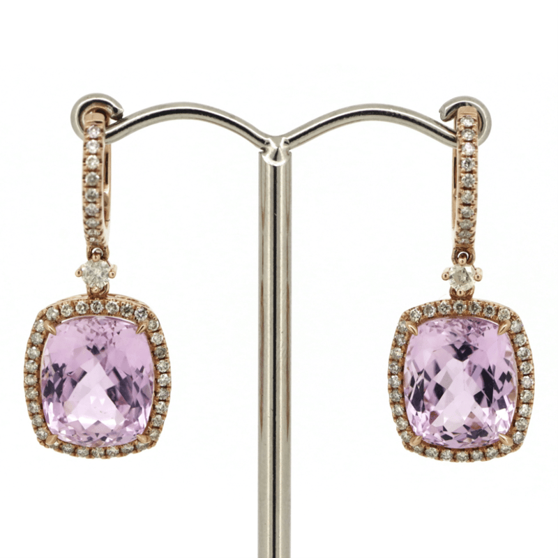 14K ROSE GOLD, KUNZITE AND DIAMOND, HALO DROP EARRINGS. THE CENTRES FEATURE, 2 CUSHION CUT, LIGHT PINKISH-PURPLE, KUNZITES (14.18CT TSW, EYE CLEAN CLARITY), 4 CLAW SET. SURROUNDING THE CENTRES IN HALOS AND DECORATING THE HOOKS ARE, 86 ROUND BRILLIANT CUT, DIAMONDS (0.63CT TDW, J-K COLOUR, SI2-I2 CLARITY), MICRO-CLAW SET. THE EARRINGS HAVE LATCH BACK CLOSURES. Jewellery Valuations Provided By A Third Party Professional Not Directly Associated With Lloyds Auctions at AUD $13,860.00This Insurance Valuation has been provided by a registered Jewellery Valuer and is intended for insurance purposes only. The valuation amount has no bearing on the auction value of the item. Any questions regarding the valuation should be directed to the issuing Valuer (refer to contact details on the certificate) as Lloyds have no association or relationship with the Valuer or the valuation amount contained within the valuation. Condition: Good - Refer Images 0645856+1619