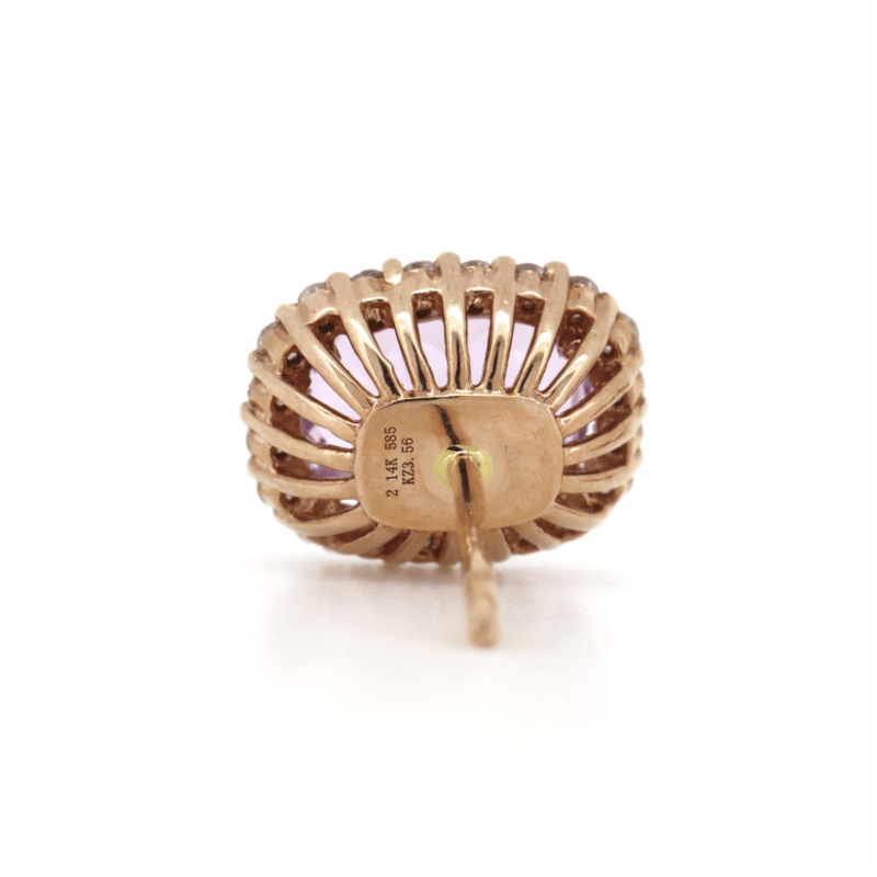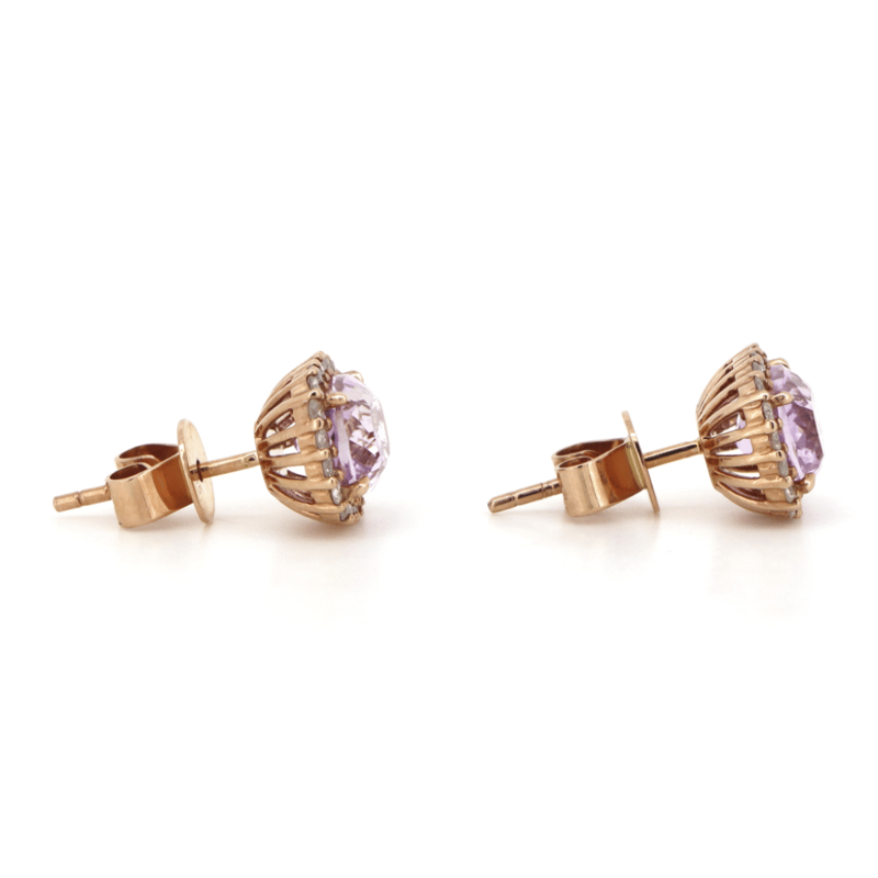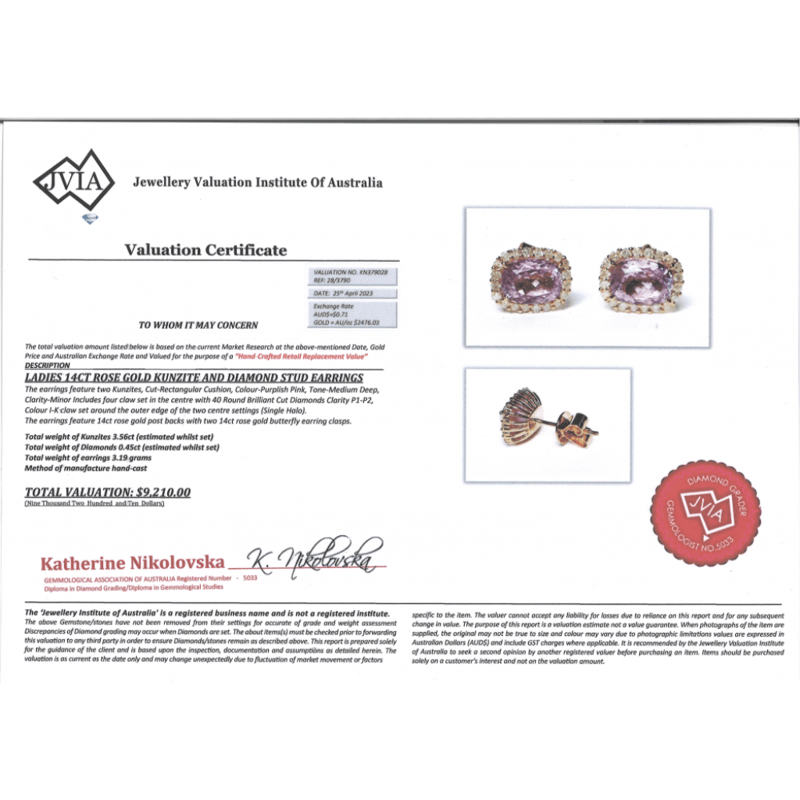 14K ROSE GOLD, KUNZITE AND DIAMOND, HALO STUD EARRINGS. THE CENTRES FEATURE, 2 RECTANGULAR CUSHION CUT, MEDIUM DEEP PURPLISH-PINK, KUNZITE (3.56CT TSW, MINOR INCLUSIONS), 4 CLAW SET. SURROUNDING THE CENTRES IN HALOS ARE, 40 ROUND BRILLIANT CUT, DIAMONDS (0.45CT TDW, I-K COLOUR, P1-P2 CLARITY), CLAW SET. THE EARRINGS HAVE POST BACKS WITH 14K ROSE GOLD BUTTERFLY CLASPS. Jewellery Valuations Provided By A Third Party Professional Not Directly Associated With Lloyds Auctions at AUD $9,210.00This Insurance Valuation has been provided by a registered Jewellery Valuer and is intended for insurance purposes only. The valuation amount has no bearing on the auction value of the item. Any questions regarding the valuation should be directed to the issuing Valuer (refer to contact details on the certificate) as Lloyds have no association or relationship with the Valuer or the valuation amount contained within the valuation. Condition: Good - Refer Images 0645856+1608