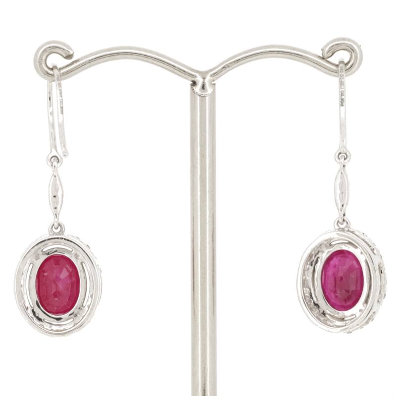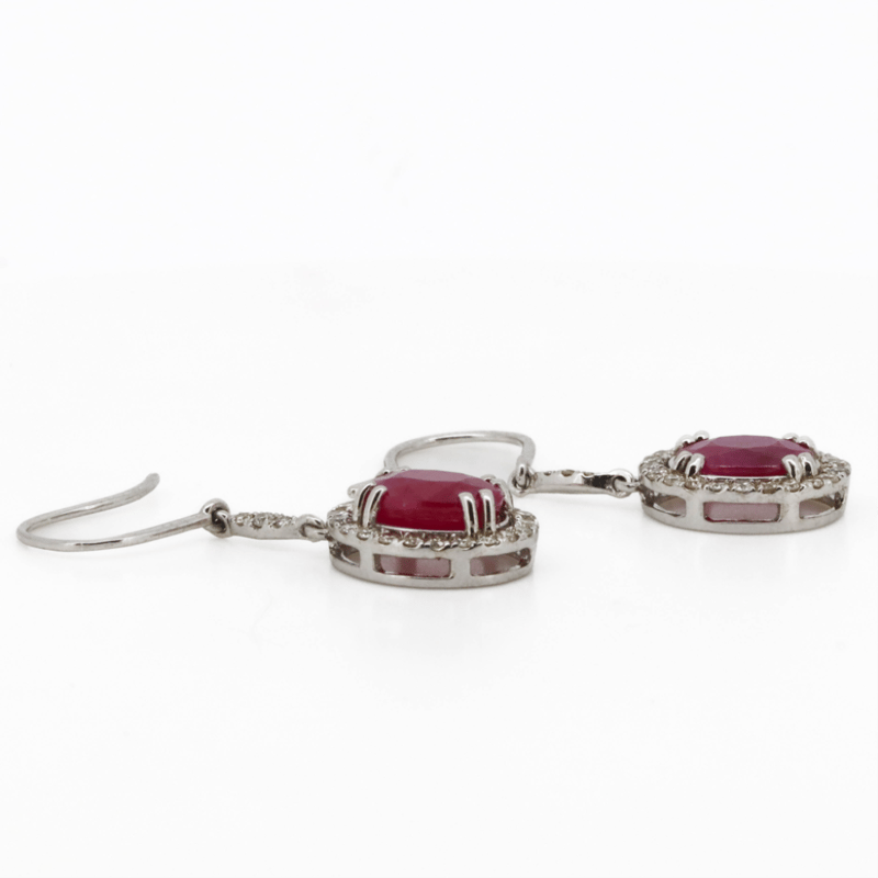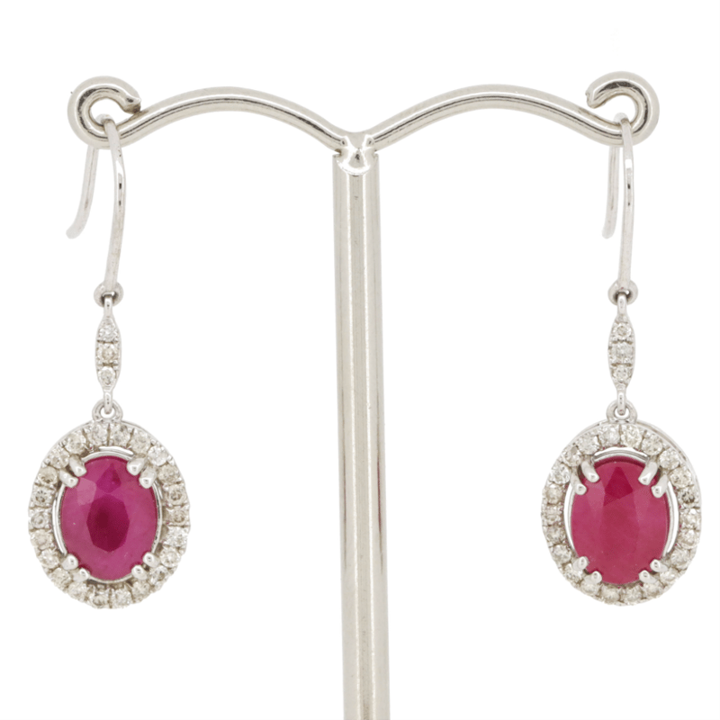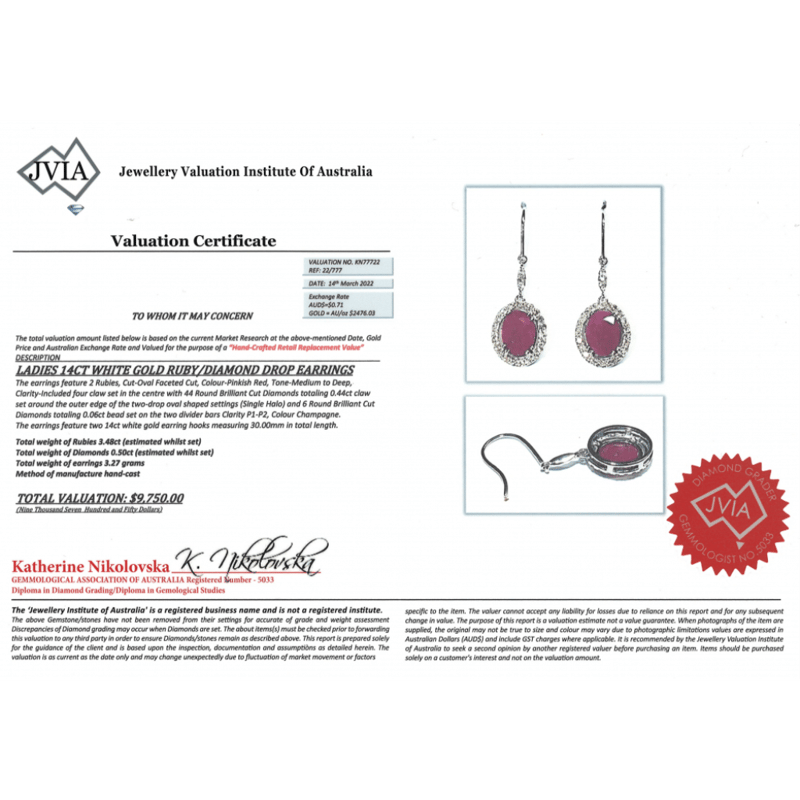 14K WHITE GOLD, RUBY, CHAMPAGNE DIAMOND, HALO DROP EARRINGS. THE CENTRES FEATURE, 2 OVAL FACETED CUT, PINKISH-RED, RUBIES (3.48CT TSW, INCLUDED), 4 CLAW SET. SURROUNDING THE CENTRES IN HALOS AND DECORATING THE DROPS ARE, 50 ROUND BRILLIANT CUT, CHAMPAGNE, DIAMONDS (0.50CT TDW, P1-P2 CLARITY), CLAW/BEAD SET. THE EARRINGS HAVE SHEPHERD HOOKS. Jewellery Valuations Provided By A Third Party Professional Not Directly Associated With Lloyds Auctions at AUD $9,750.00This Insurance Valuation has been provided by a registered Jewellery Valuer and is intended for insurance purposes only. The valuation amount has no bearing on the auction value of the item. Any questions regarding the valuation should be directed to the issuing Valuer (refer to contact details on the certificate) as Lloyds have no association or relationship with the Valuer or the valuation amount contained within the valuation. Condition: Good - Refer Images 0645856+1670