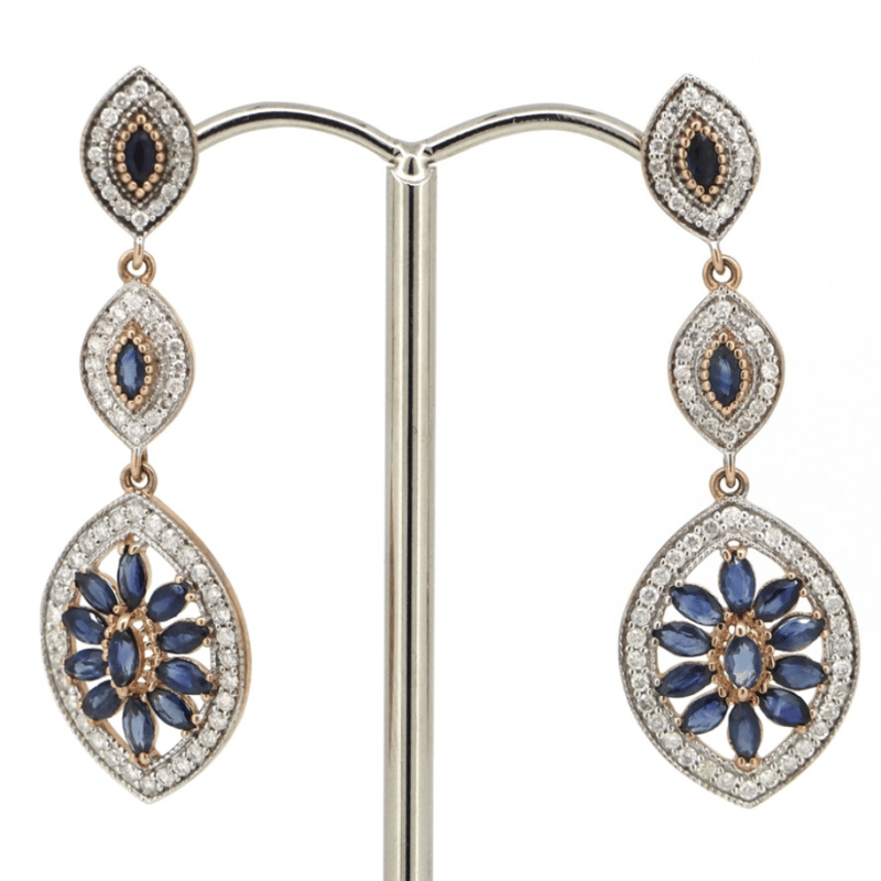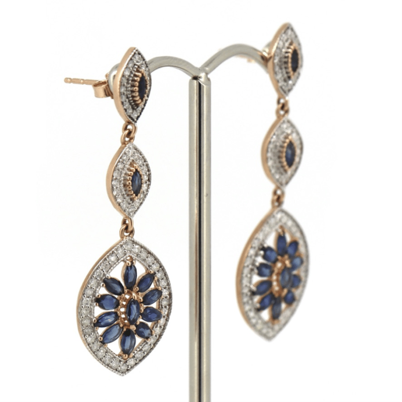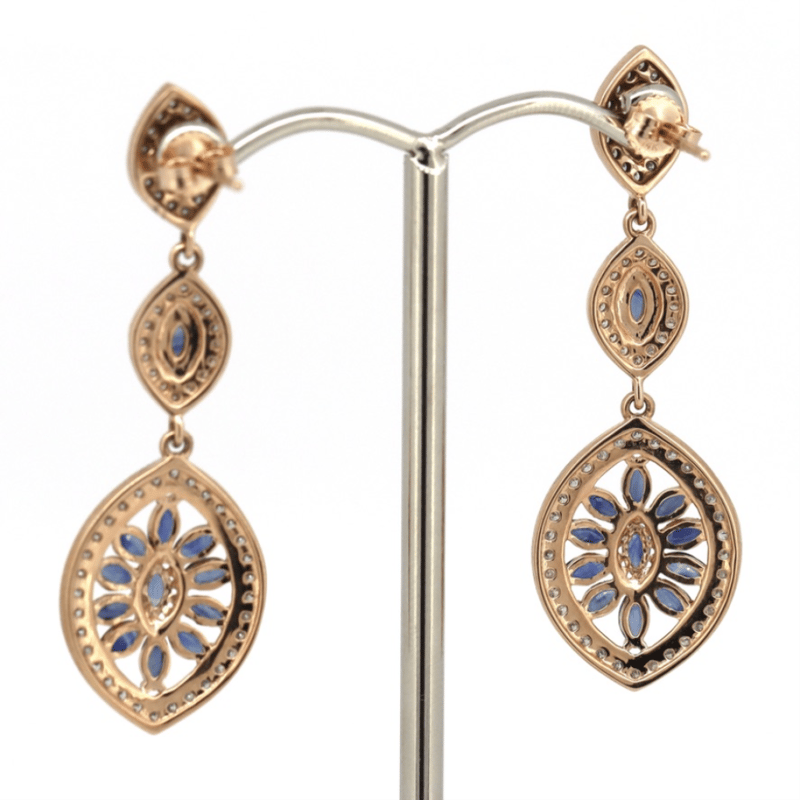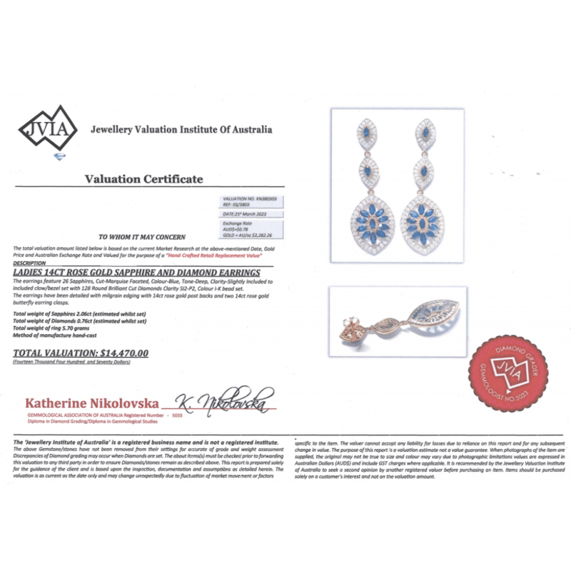 14K ROSE GOLD, SAPPHIRE AND DIAMOND, ART DECO INSPIRED DROP EARRINGS. THE DESIGN FEATURES, 26 MARQUISE FACETED CUT, DEEP BLUE, SAPPHIRES (2.06CT TSW, SLIGHTLY INCLUDED-INCLUDED), CLAW/BEZEL SET. ACCOMPANYING THE SAPPHIRES ARE, 128 ROUND BRILLIANT CUT, DIAMONDS (0.76CT TDW, I-K COLOUR, SI2-P2 CLARITY), BEAD SET. THE EARRINGS HAVE MILLEGRAIN DETAILING WITH 14K ROSE GOLD POST BACKS AND BUTTERFLY CLASPS. Jewellery Valuations Provided By A Third Party Professional Not Directly Associated With Lloyds Auctions at AUD $14,470.00This Insurance Valuation has been provided by a registered Jewellery Valuer and is intended for insurance purposes only. The valuation amount has no bearing on the auction value of the item. Any questions regarding the valuation should be directed to the issuing Valuer (refer to contact details on the certificate) as Lloyds have no association or relationship with the Valuer or the valuation amount contained within the valuation. Condition: Good - Refer Images 0645856+1687