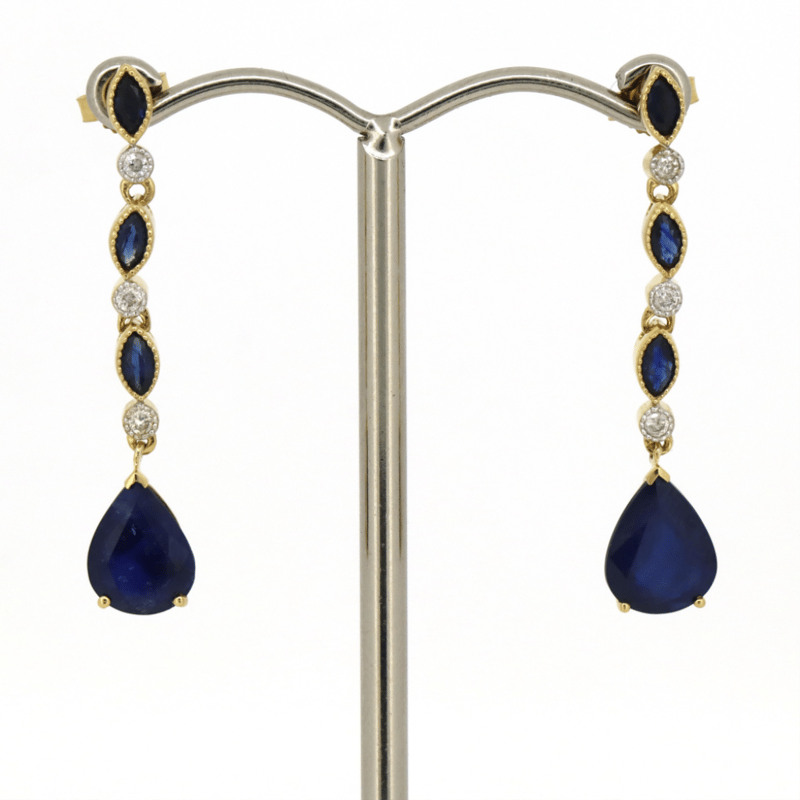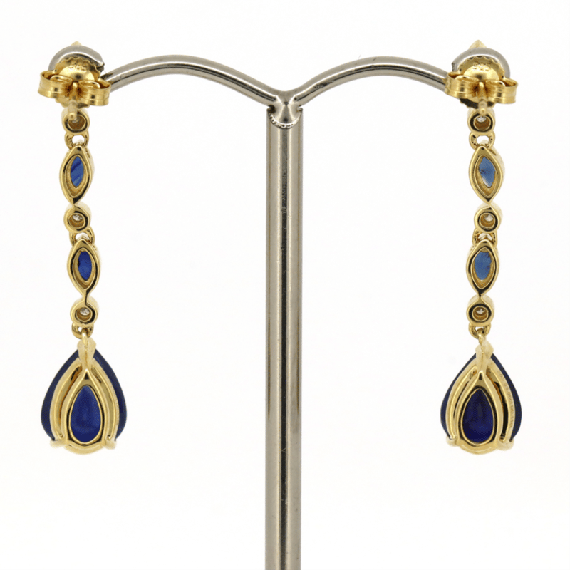14K YELLOW GOLD, SAPPHIRE AND DIAMOND, DROP EARRINGS. THE EARRINGS FEATURE, 80 PEAR/MARQUISE CUT, SAPPHIRE (3.88CT TSW, MINOR EYE VISIBLE INCLUSIONS), V PRONG SET, CLAW SET, BEZEL SET. ENCOMPASSING THE CENTRE ARE, 6 ROUND BRILLIANT CUT, DIAMONDS (0.11CT TDW, J-K COLOUR, SI2-I2 CLARITY), BEZEL SET. THE EARRINGS FEATURE POST BACKS WITH BUTTERFLY CLASPS. Jewellery Valuations Provided By A Third Party Professional Not Directly Associated With Lloyds Auctions at AUD $9,290.00This Insurance Valuation has been provided by a registered Jewellery Valuer and is intended for insurance purposes only. The valuation amount has no bearing on the auction value of the item. Any questions regarding the valuation should be directed to the issuing Valuer (refer to contact details on the certificate) as Lloyds have no association or relationship with the Valuer or the valuation amount contained within the valuation. Condition: Good - Refer Images 0645856+1677