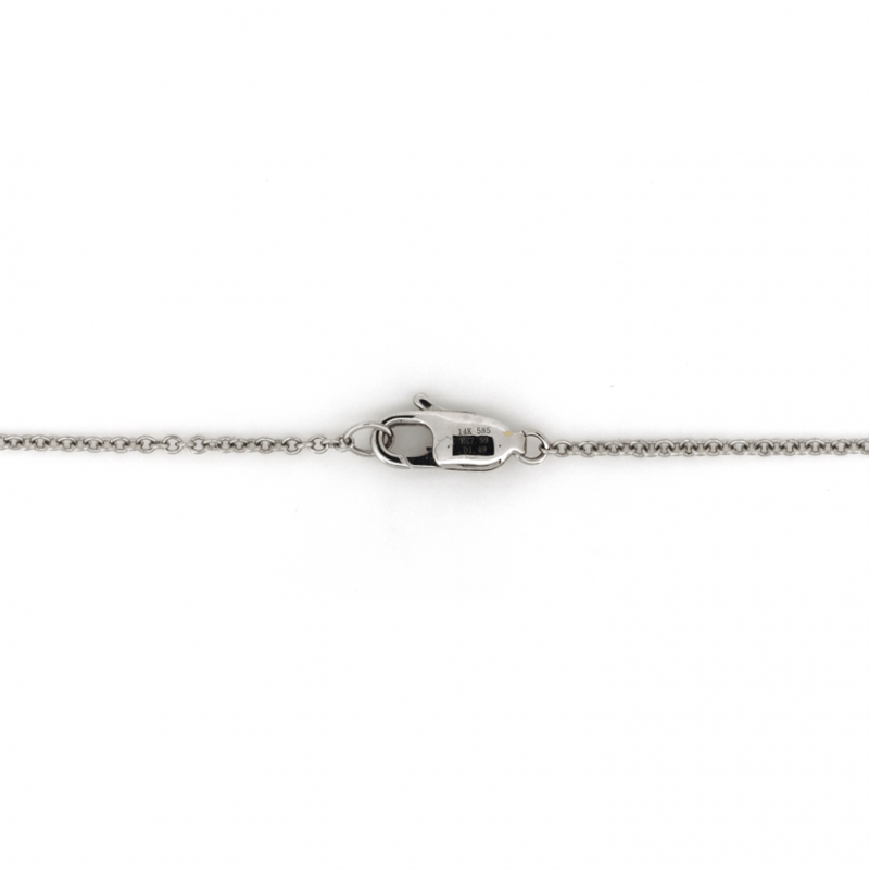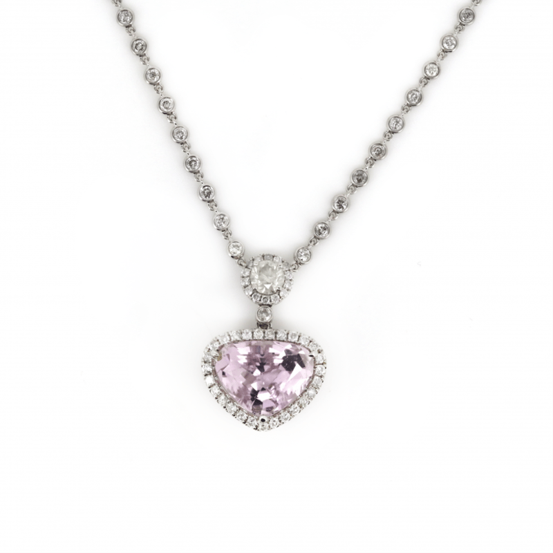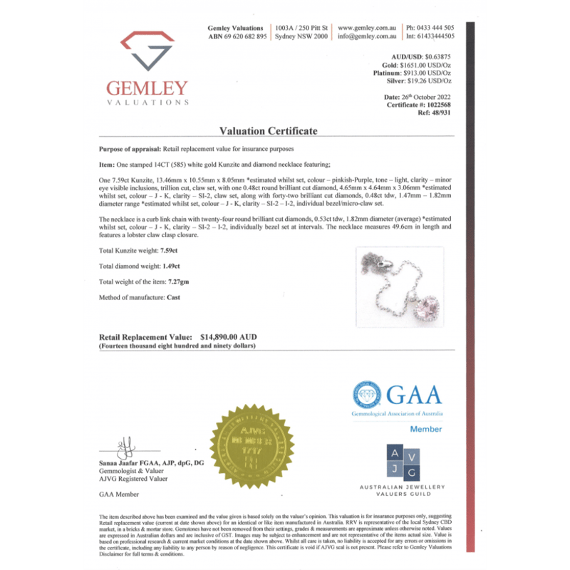 14K WHITE GOLD, 7.59CT KUNZITE AND DIAMOND, STATEMENT NECKLACE. THE PENDANT FEATURES, ONE TRILLION CUT, LIGHT PINKISH-PURPLE, KUNZITE (7.59CT, MINOR EYE VISIBLE INCLUSIONS), CLAW SET. SURMOUNTED BY, ONE ROUND BRILLIANT CUT, DIAMOND (0.48CT, J-K COLOUR, SI2 CLARITY), CLAW SET. ENCOMPASSING THE KUNZITE AND DIAMOND AND DECORATING THE CHAIN ARE, 66 ROUND BRILLIANT CUT, DIAMONDS (1.01CT TDW, J-K COLOUR, SI2-I2 CLARITY), BEZEL/MICRO-CLAW SET. THE NECKLACE HAS A LOBSTER CLAW CLASP. CHAIN LENGTH IS 48CM (ADJUSTABLE). Jewellery Valuations Provided By A Third Party Professional Not Directly Associated With Lloyds Auctions at AUD $14,890.00This Insurance Valuation has been provided by a registered Jewellery Valuer and is intended for insurance purposes only. The valuation amount has no bearing on the auction value of the item. Any questions regarding the valuation should be directed to the issuing Valuer (refer to contact details on the certificate) as Lloyds have no association or relationship with the Valuer or the valuation amount contained within the valuation. Condition: Good - Refer Images 0645856+1699