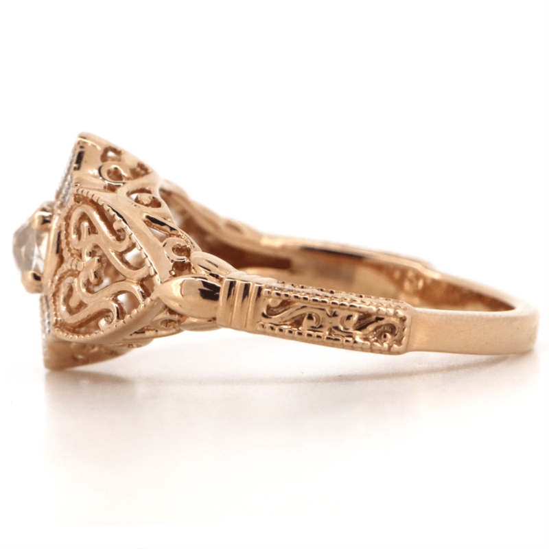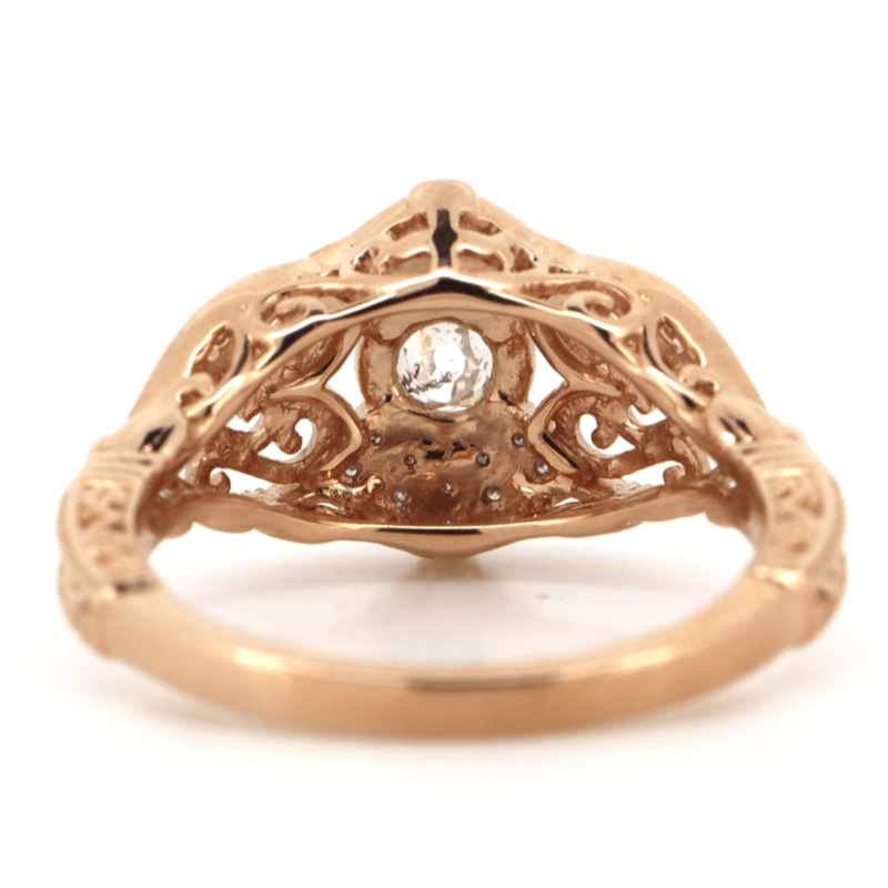 14K ROSE GOLD AND DIAMOND, ART DECO INSPIRED RING. THE CENTRE FEATURES, ONE OLD MINE CUT, DIAMOND (0.40CT, H-I COLOUR, SI1-SI2 CLARITY), CLAW SET WITH MILLEGRAIN DETAIL. SURROUNDING THE CENTRE ARE, 20 ROUND BRILLIANT CUT, DIAMONDS (0.08CT TDW, H-I COLOUR, SI1-SI2 CLARITY), PIP SET WITH MILLEGRAIN DETAIL. RING SIZE N 1/2. Jewellery Valuations Provided By A Third Party Professional Not Directly Associated With Lloyds Auctions at AUD $8,000.00This Insurance Valuation has been provided by a registered Jewellery Valuer and is intended for insurance purposes only. The valuation amount has no bearing on the auction value of the item. Any questions regarding the valuation should be directed to the issuing Valuer (refer to contact details on the certificate) as Lloyds have no association or relationship with the Valuer or the valuation amount contained within the valuation. Condition: Good - Refer Images 0645856+1660