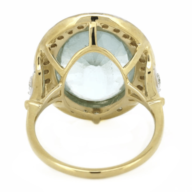 14K YELLOW/WHITE GOLD, AQUAMARINE AND DIAMOND, HALO COCKTAIL RING.