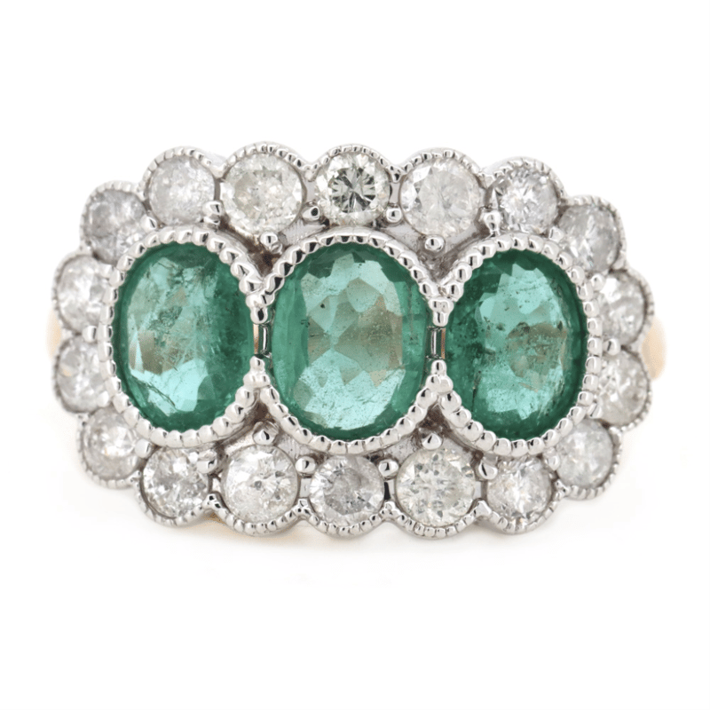 The Centre Features, 3 Oval Cut, Bluish-Green, Emeralds (1.65Ct Tsw, Minor Eye Visible Inclusions), Semi-Bezel Set. Surrounding The Centre Are, 18 Round Brilliant Cut, Diamonds (1.08Ct Tdw, H-K Colour, Si2-I2 Clarity), Bead Set In White Gold With Millegrain Detail. Ring Size M 1/2.