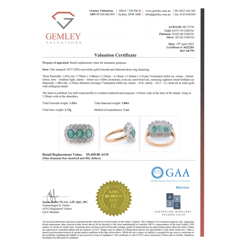 This Insurance Valuation has been provided by a registered Jewellery Valuer and is intended for insurance purposes only. The valuation amount has no bearing on the auction value of the item. Any questions regarding the valuation should be directed to the issuing Valuer (refer to contact details on the certificate) as Lloyds have no association or relationship with the Valuer or the valuation amount contained within the valuation.