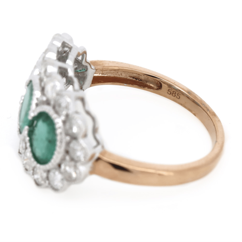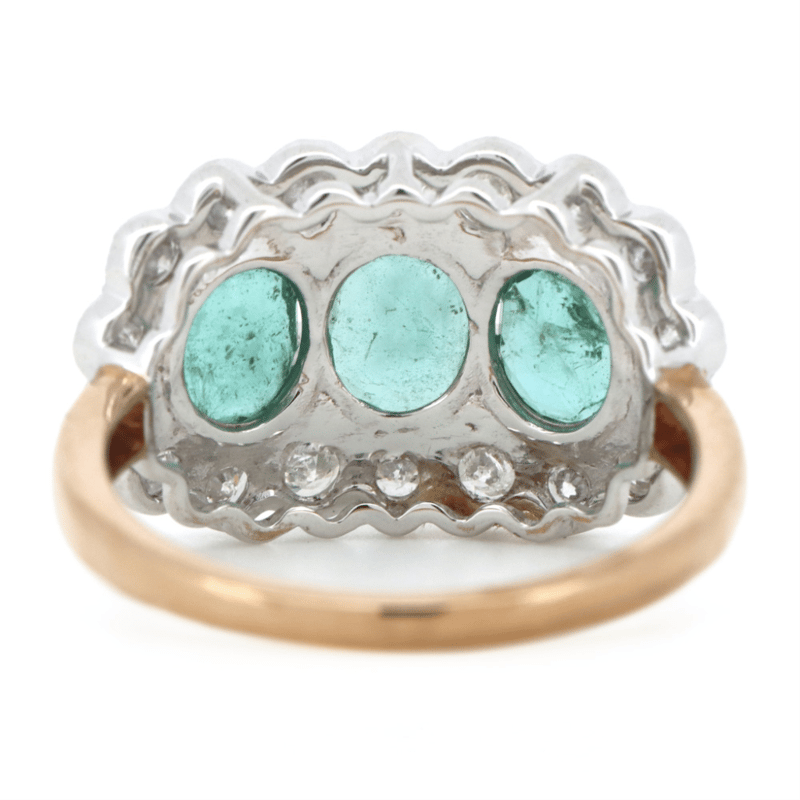 14K ROSE/WHITE GOLD, EMERALD AND DIAMOND, HALO TRILOGY RING.