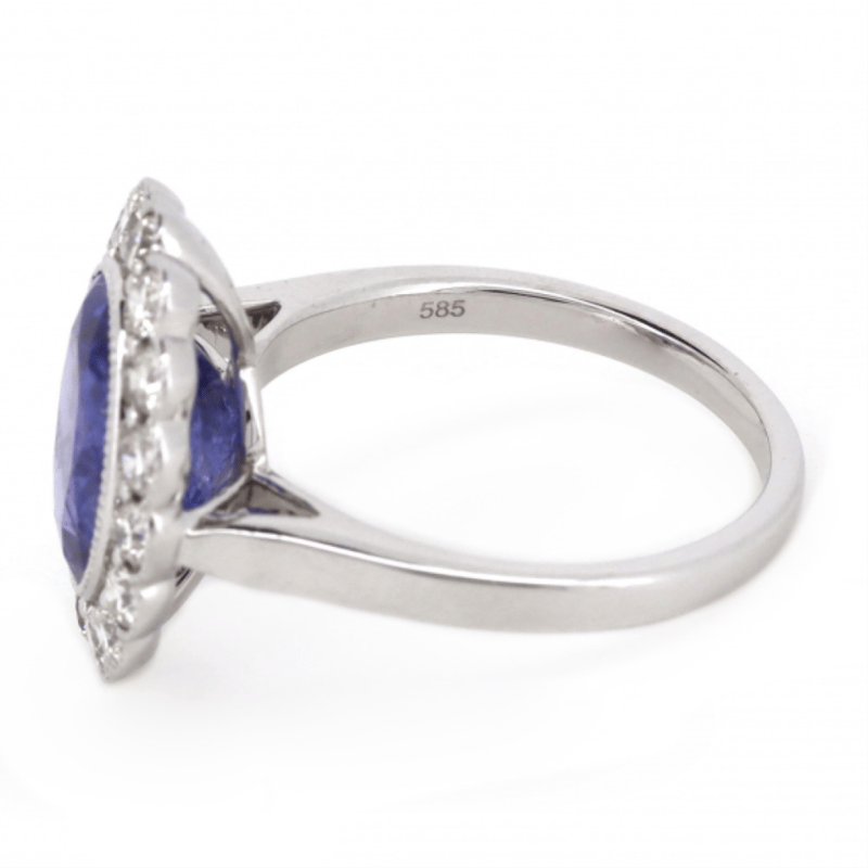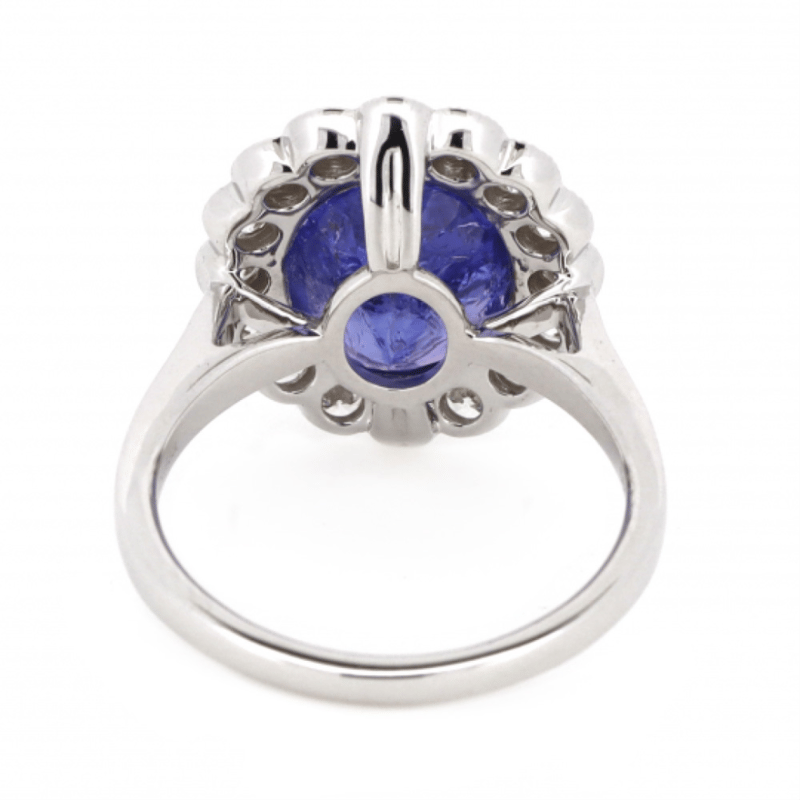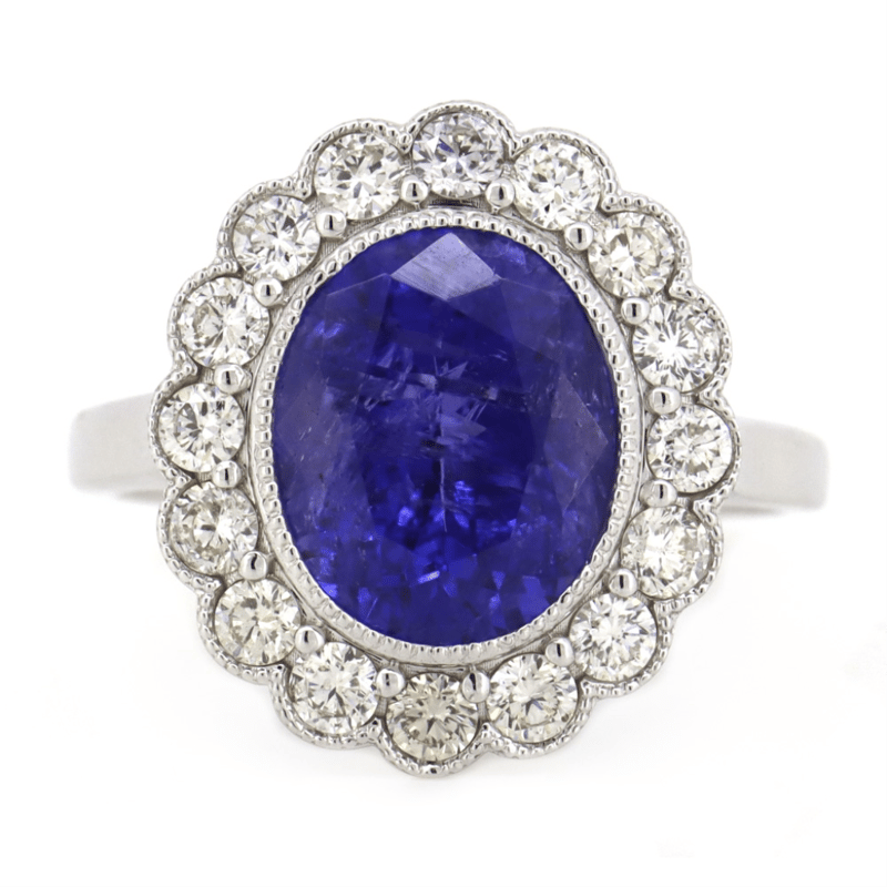 The Centre Features, One Oval Cut, Medium-Dark Purplish-Blue, Tanzanite (4.13Ct, Eye Visible Inclusions), Bezel Set. Surrounding The Centre In A Halo Are, 18 Round Brilliant Cut, Diamonds (0.93Ct Tdw, H-J Colour, Si2-I1 Clarity), Bar/Bead Set With Millegrain Detail. Ring Size O.