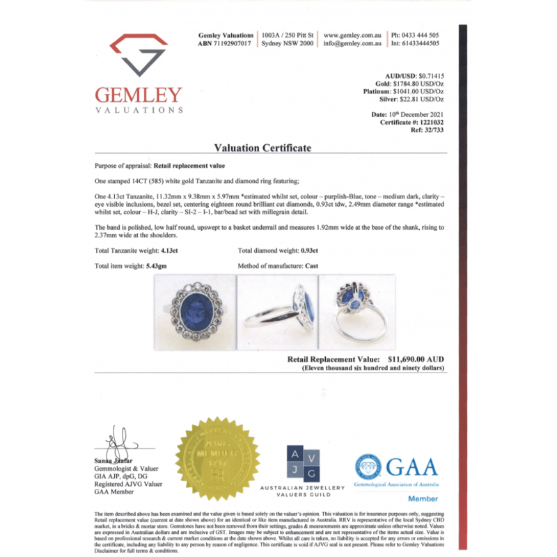 This Insurance Valuation has been provided by a registered Jewellery Valuer and is intended for insurance purposes only. The valuation amount has no bearing on the auction value of the item. Any questions regarding the valuation should be directed to the issuing Valuer (refer to contact details on the certificate) as Lloyds have no association or relationship with the Valuer or the valuation amount contained within the valuation.