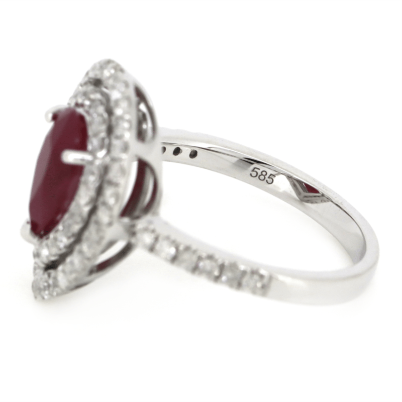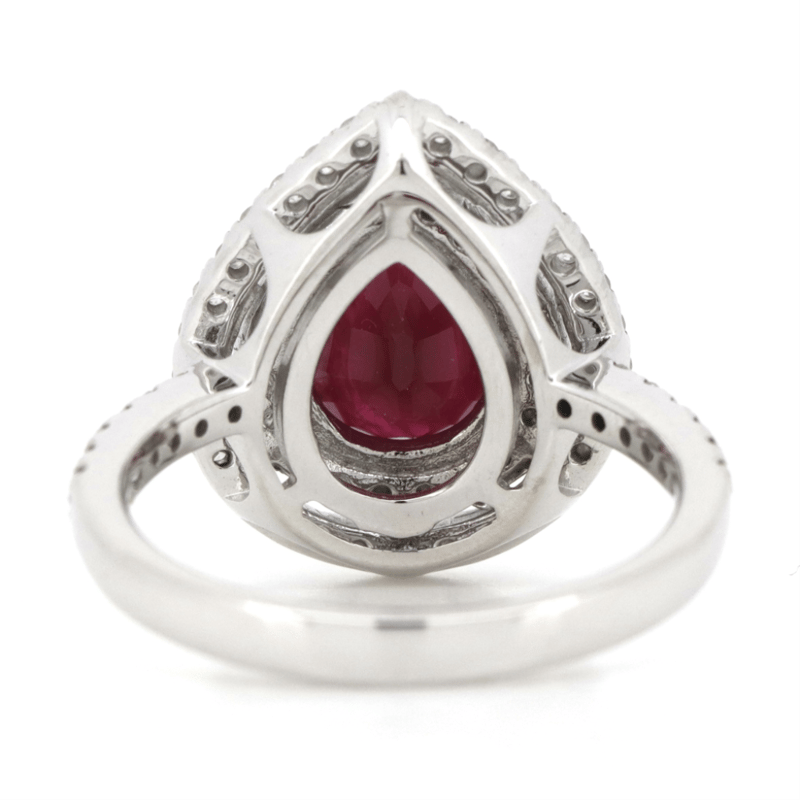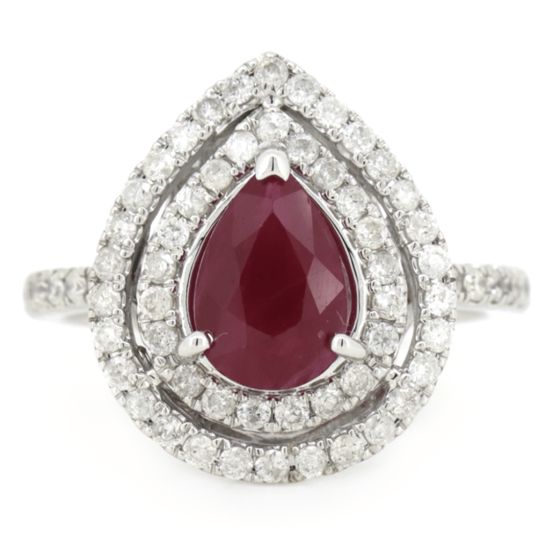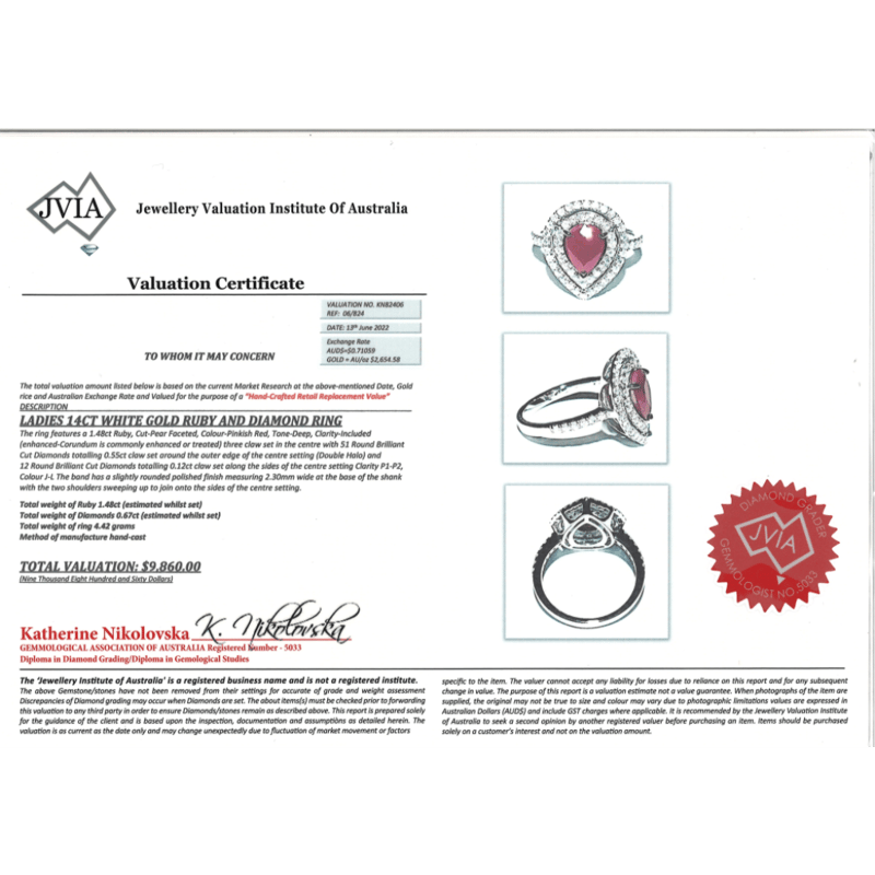 14K WHITE GOLD, RUBY AND DIAMOND, DOUBLE HALO RING. The Centre Features, One Pear Faceted Cut, Deep Pinkish Red, Ruby (1.48Ct, Included, Enhanced), 3 Claw Set. Surrounding The Centre In A Double Halo And Decorating The Band Are, 63 Round Brilliant Cut, Diamonds (0.67Ct Tdw, J-L Colour, P1-P2 Clarity), Claw Set. Ring Size M. Jewellery Valuations Provided By A Third Party Professional Not Directly Associated With Lloyds Auctions at AUD $9,860.00This Insurance Valuation has been provided by a registered Jewellery Valuer and is intended for insurance purposes only. The valuation amount has no bearing on the auction value of the item. Any questions regarding the valuation should be directed to the issuing Valuer (refer to contact details on the certificate) as Lloyds have no association or relationship with the Valuer or the valuation amount contained within the valuation. Condition: NEW 0645868+1335