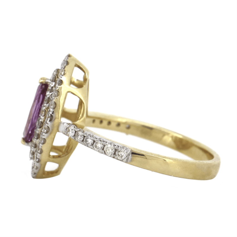 14K YELLOW GOLD, PINK SAPPHIRE AND DIAMOND, DOUBLE HALO RING.
