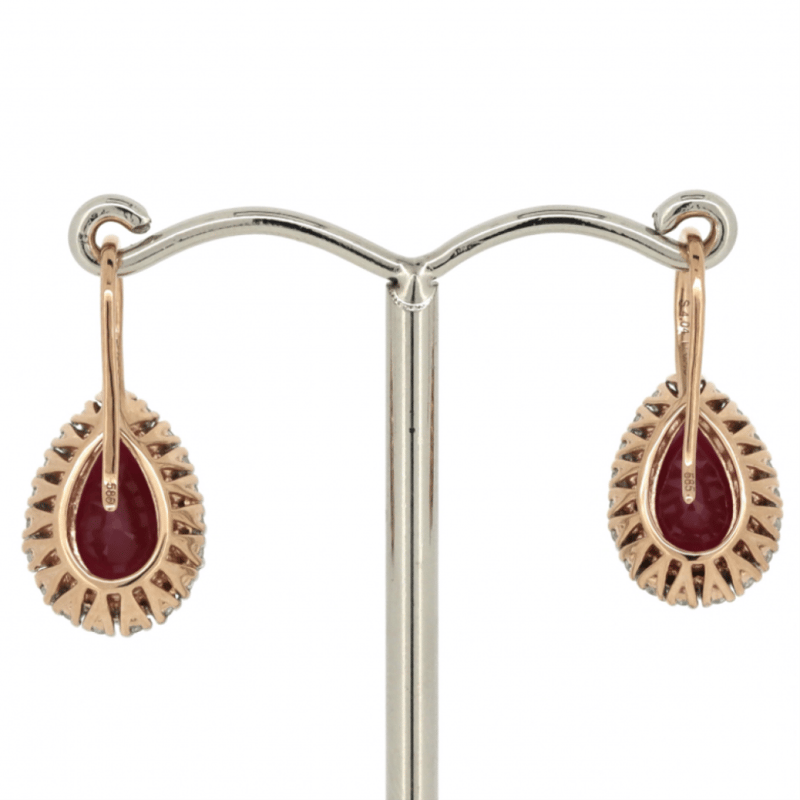 The Centres Feature, 2 Pear Faceted Cut, Pinkish-Red, Rubies (5.43Ct Tsw, Included, Enhanced), 3 Claw Set. Surrounding The Centres In Halos Are, 36 Round Brilliant Cut, Diamonds (0.46Ct Tdw, J-L Colour, P1-P2 Clarity), Claw Set. The Earrings Have Shepherd Hooks.