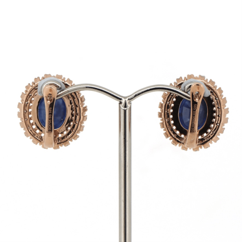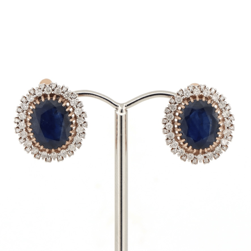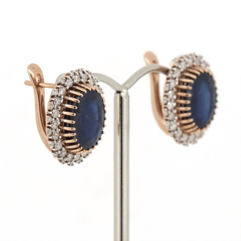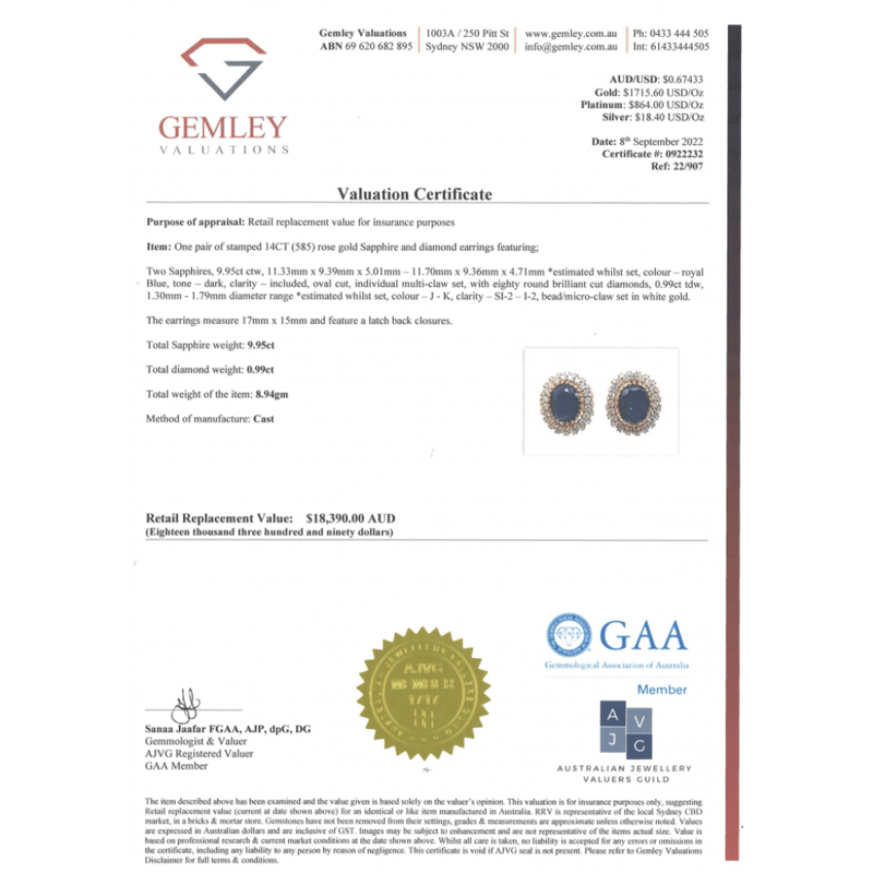 14K ROSE GOLD, BLUE SAPPHIRE AND DIAMOND, EARRINGS. The Centres Feature, 2 Oval Cut, Dark Royal Blue, Sapphires (9.95Ct Tsw, Included), Multi-Claw Set. Surrounding The Centres In Halos Are, 80 Round Brilliant Cut, Diamonds (0.99Ct Tdw, J-K Colour, Si2-I2 Clarity), Bead/Micro-Claw Set In White Gold. The Earrings Have Latch Backs Closures. Jewellery Valuations Provided By A Third Party Professional Not Directly Associated With Lloyds Auctions at AUD $18,390.00This Insurance Valuation has been provided by a registered Jewellery Valuer and is intended for insurance purposes only. The valuation amount has no bearing on the auction value of the item. Any questions regarding the valuation should be directed to the issuing Valuer (refer to contact details on the certificate) as Lloyds have no association or relationship with the Valuer or the valuation amount contained within the valuation. Condition: NEW 0645868+1322