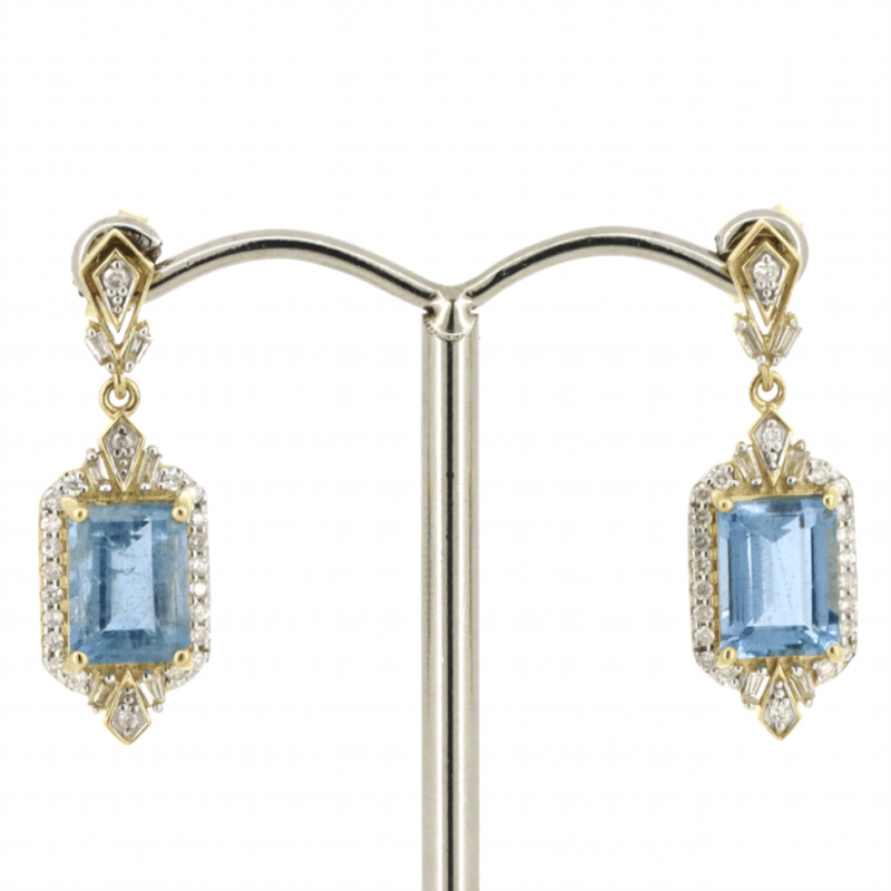14K YELLOW/WHITE GOLD, AQUAMARINE AND DIAMOND, DROP EARRINGS.