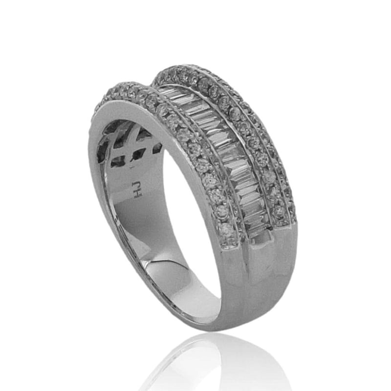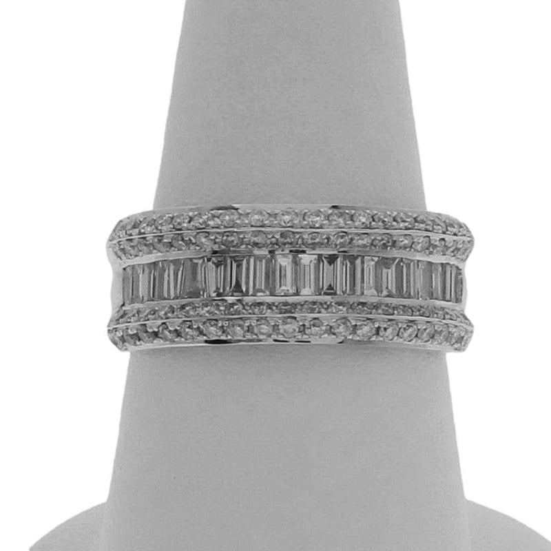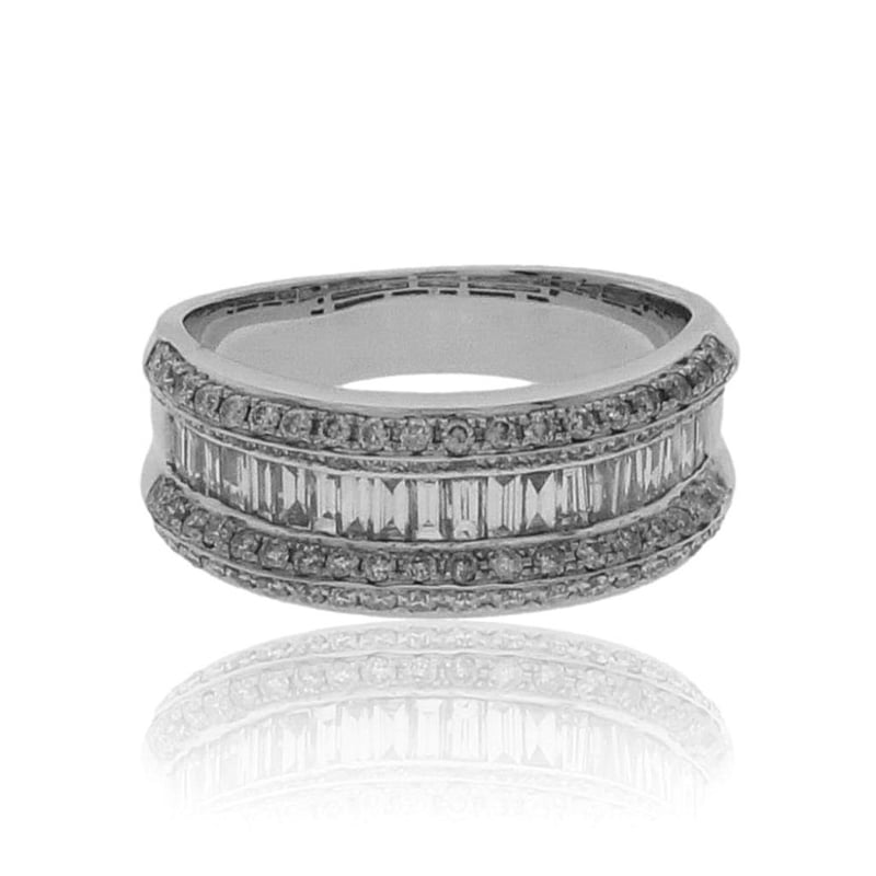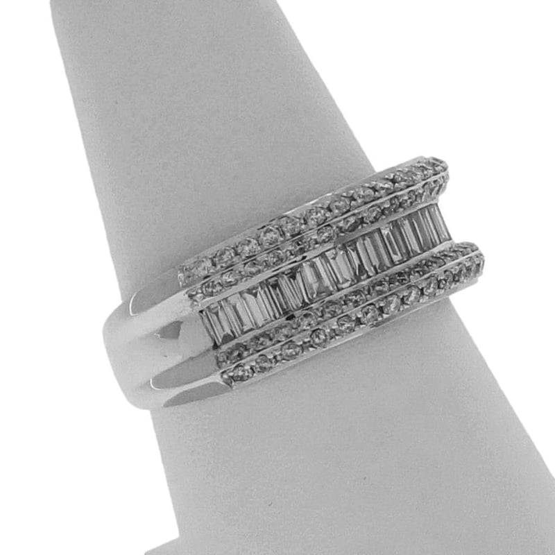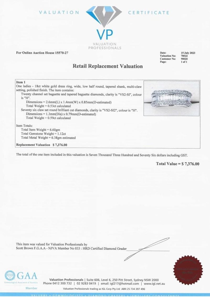 18CT WHITE GOLD DRESS RING One Ladies - 18Ct White Gold Dress Ring, Wide, Low Half Round, Tapered Shank, Multi-Claw Setting, Polished Finish. The Item Contains: Twenty Channel Set Baguette And Tapered Baguette Diamonds, Clarity Is "Vs2-Si", Colour Is "H". Dimensions = 2.6Mm(L) X 1.4Mm(W) X 0.85Mm(D-Estimated) Total Weight = 0.53Ct Calculated Seventy Six Claw Set Round Brilliant Cut Diamonds, Clarity Is "Vs2-Si2", Colour Is "H". Dimensions = 1.3Mm(Dia) X 0.79Mm(D-Estimated) Total Weight = 0.59Ct Calculated Item Totals: Total Item Weight = 6.60Gm Total Gemstone Weight = 1.12Ct Total Metal Weight = 6.38Gm Estimated Valuations Provided by an Independent Third-Party Professional Not Directly Associated With Lloyds Auctions at AUD $7376 This valuation has been conducted by an independent third-party professional. The valuation amount is an assessment by the issuing valuer and does not reflect the auction value of the item. Any inquiries regarding the valuation should be directed to the issuing valuer (refer to contact details on the certificate), as Lloyds Auctions has no affiliation or influence over the valuation, the valuer, or the stated amount. Condition: Good - Refer Images 0 488973+9