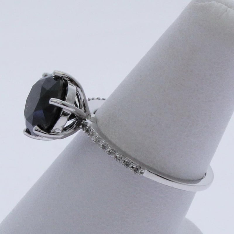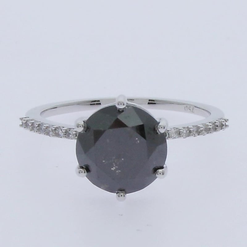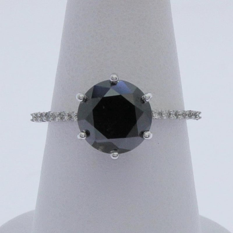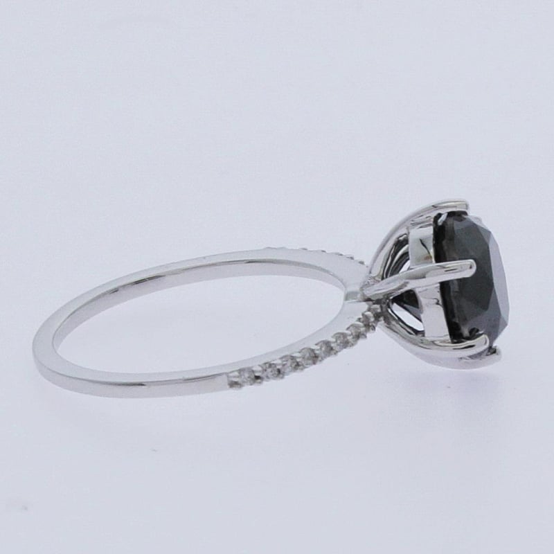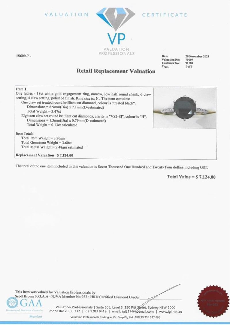 18CT WHITE GOLD ENGAGEMENT RING One Ladies - 18Ct White Gold Engagement Ring, Narrow, Low Half Round Shank, 6 Claw Setting, 4 Claw Setting, Polished Finish. Ring Size Is: N.. The Item Contains: One Claw Set Treated Round Brilliant Cut Diamond, Colour Is "Treated Black". Dimensions = 8.9Mm(Dia) X 7.1Mm(D-Estimated) Total Weight = 3.47Ct Eighteen Claw Set Round Brilliant Cut Diamonds, Clarity Is "Vs2-Si", Colour Is "H". Dimensions = 1.3Mm(Dia) X 0.79Mm(D-Estimated) Total Weight = 0.13Ct CalculatedItem Totals: Total Item Weight = 3.20Gm Total Gemstone Weight = 3.60Ct Total Metal Weight = 2.48Gm Estimated Valuations Provided by an Independent Third-Party Professional Not Directly Associated With Lloyds Auctions at AUD $7124This valuation has been conducted by an independent third-party professional. The valuation amount is an assessment by the issuing valuer and does not reflect the auction value of the item. Any inquiries regarding the valuation should be directed to the issuing valuer (refer to contact details on the certificate), as Lloyds Auctions has no affiliation or influence over the valuation, the valuer, or the stated amount. Condition: Good - Refer Images 0488972+4