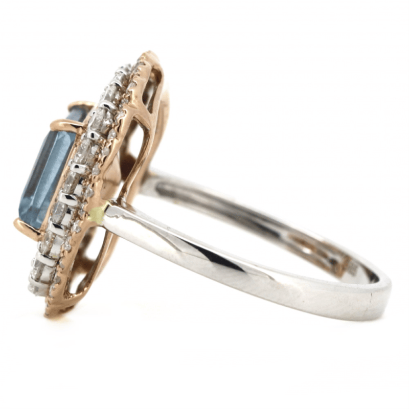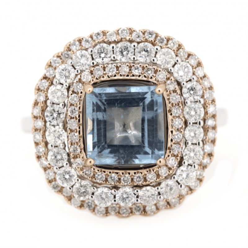 14K ROSE/WHITE GOLD, AQUAMARINE AND DIAMOND, TRIPLE HALO RING. The Centre Features, One Square Cut, Medium Light Greyish-Blue, Aquamarine (1.71Ct Tsw, Minor Eye Visible Inclusions), 4 Claw Set. Surrounding The Centre In A Triple Halo Are, 94 Round Brilliant Cut, Diamonds (0.87Ct Tdw, J-K Colour, Si2-I2 Clarity), Claw Set In White/Rose Gold. Ring Size L. 14K Rose/White Gold, Aquamarine And Diamond, Triple Halo Ring. The Centre Features, One Square Cut, Medium Light Greyish-Blue, Aquamarine (1.71Ct Tsw, Minor Eye Visible Inclusions), 4 Claw Set. Surrounding The Centre In A Triple Halo Are, 94 Round Brilliant Cut, Diamonds (0.87Ct Tdw, J-K Colour, Si2-I2 Clarity), Claw Set In White/Rose Gold. Ring Size L. Jewellery Valuations Provided By A Third Party Professional Not Directly Associated With Lloyds Auctions at AUD $9,190.00This Insurance Valuation has been provided by a registered Jewellery Valuer and is intended for insurance purposes only. The valuation amount has no bearing on the auction value of the item. Any questions regarding the valuation should be directed to the issuing Valuer (refer to contact details on the certificate) as Lloyds have no association or relationship with the Valuer or the valuation amount contained within the valuation. Condition: NEW 0584876+1403