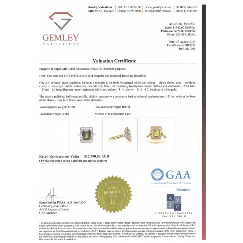 14K YELLOW GOLD, GREEN SAPPHIRE AND DIAMOND, HALO RING. The Centre Features, One Emerald Cut, Medium Bluish-Green, Sapphire (2.77Ct, Minor Eye Visible Inclusions), Bezel Set. Surrounding The Centre In A Halo And Decorating The Shoulders Are, 24 Round Brilliant Cut, Diamonds (0.87Ct Tdw, J-K Colour, Si2-I2 Clarity), Bead Set In White Gold. Ring Size N ½. 14K Yellow Gold, Green Sapphire And Diamond, Halo Ring. The Centre Features, One Emerald Cut, Medium Bluish-Green, Sapphire (2.77Ct, Minor Eye Visible Inclusions), Bezel Set. Surrounding The Centre In A Halo And Decorating The Shoulders Are, 24 Round Brilliant Cut, Diamonds (0.87Ct Tdw, J-K Colour, Si2-I2 Clarity), Bead Set In White Gold. Ring Size N ½. Jewellery Valuations Provided By A Third Party Professional Not Directly Associated With Lloyds Auctions at AUD $12,790.00This Insurance Valuation has been provided by a registered Jewellery Valuer and is intended for insurance purposes only. The valuation amount has no bearing on the auction value of the item. Any questions regarding the valuation should be directed to the issuing Valuer (refer to contact details on the certificate) as Lloyds have no association or relationship with the Valuer or the valuation amount contained within the valuation. Condition: NEW 0584876+1464
