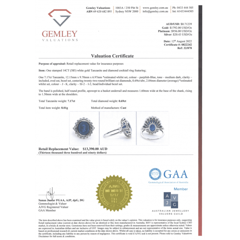 14K WHITE GOLD, 7.17CT TANZANITE AND DIAMOND, COCKTAIL RING. The Centre Features, One Oval Cut, Medium Dark Purplish-Blue, Tanzanite (7.17Ct, Included), Bezel Set. Surrounding The Centre In A Halo And Decorating The Shoulders Are, 22 Round Brilliant Cut, Diamonds (0.69Ct Tdw, J-K Colour, Si2-I2 Clarity), Bead/Bezel Set. Ring Size O 1/2. 14K White Gold, 7.17Ct Tanzanite And Diamond, Cocktail Ring. The Centre Features, One Oval Cut, Medium Dark Purplish-Blue, Tanzanite (7.17Ct, Included), Bezel Set. Surrounding The Centre In A Halo And Decorating The Shoulders Are, 22 Round Brilliant Cut, Diamonds (0.69Ct Tdw, J-K Colour, Si2-I2 Clarity), Bead/Bezel Set. Ring Size O 1/2. Jewellery Valuations Provided By A Third Party Professional Not Directly Associated With Lloyds Auctions at AUD $13,390.00This Insurance Valuation has been provided by a registered Jewellery Valuer and is intended for insurance purposes only. The valuation amount has no bearing on the auction value of the item. Any questions regarding the valuation should be directed to the issuing Valuer (refer to contact details on the certificate) as Lloyds have no association or relationship with the Valuer or the valuation amount contained within the valuation. Condition: NEW 0584876+1422