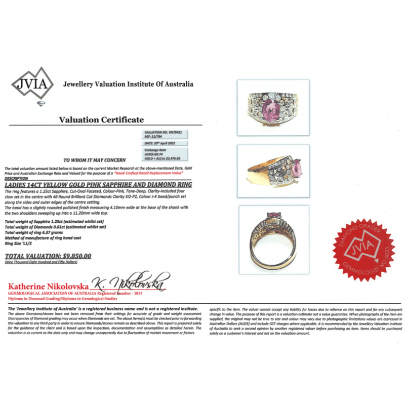 14K YELLOW GOLD, PINK SAPPHIRE AND DIAMOND, DECORATIVE RING. The Centre Features, One Oval Faceted Cut, Deep Pink, Sapphire (1.25Ct Tsw, Included), 4 Claw Set. Surrounding The Centre In A Halo And Decorative Band Design Are, 46 Round Brilliant Cut, Diamonds (0.61Ct Tdw, J-K Colour, Si2-P2 Clarity), Bead/Punch Set. Ring Size L 1/2. 14K Yellow Gold, Pink Sapphire And Diamond, Decorative Ring. The Centre Features, One Oval Faceted Cut, Deep Pink, Sapphire (1.25Ct Tsw, Included), 4 Claw Set. Surrounding The Centre In A Halo And Decorative Band Design Are, 46 Round Brilliant Cut, Diamonds (0.61Ct Tdw, J-K Colour, Si2-P2 Clarity), Bead/Punch Set. Ring Size L 1/2. Jewellery Valuations Provided By A Third Party Professional Not Directly Associated With Lloyds Auctions at AUD $9,850.00This Insurance Valuation has been provided by a registered Jewellery Valuer and is intended for insurance purposes only. The valuation amount has no bearing on the auction value of the item. Any questions regarding the valuation should be directed to the issuing Valuer (refer to contact details on the certificate) as Lloyds have no association or relationship with the Valuer or the valuation amount contained within the valuation. Condition: NEW 0584876+1439