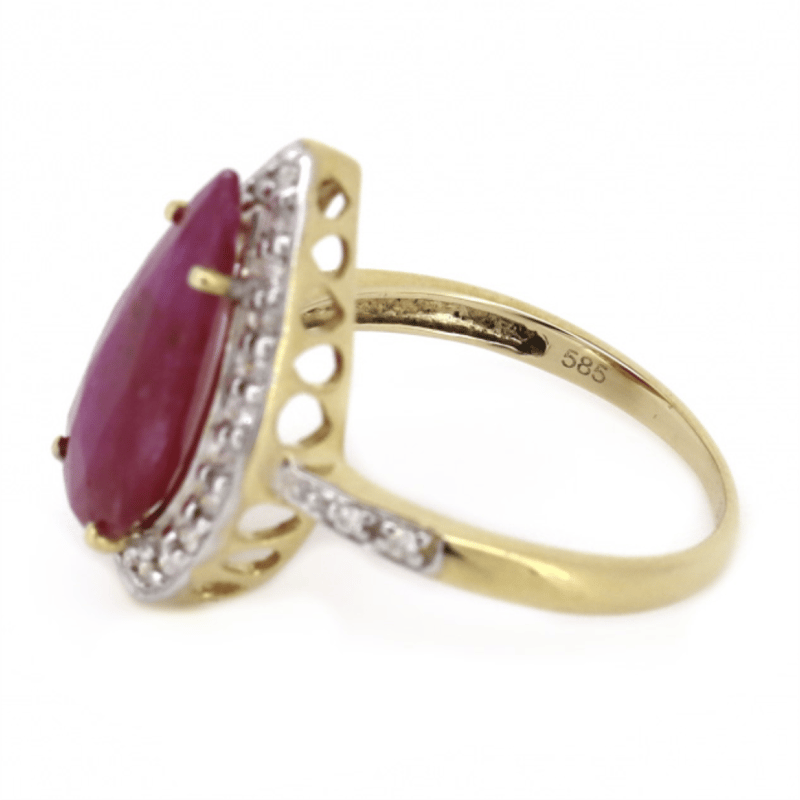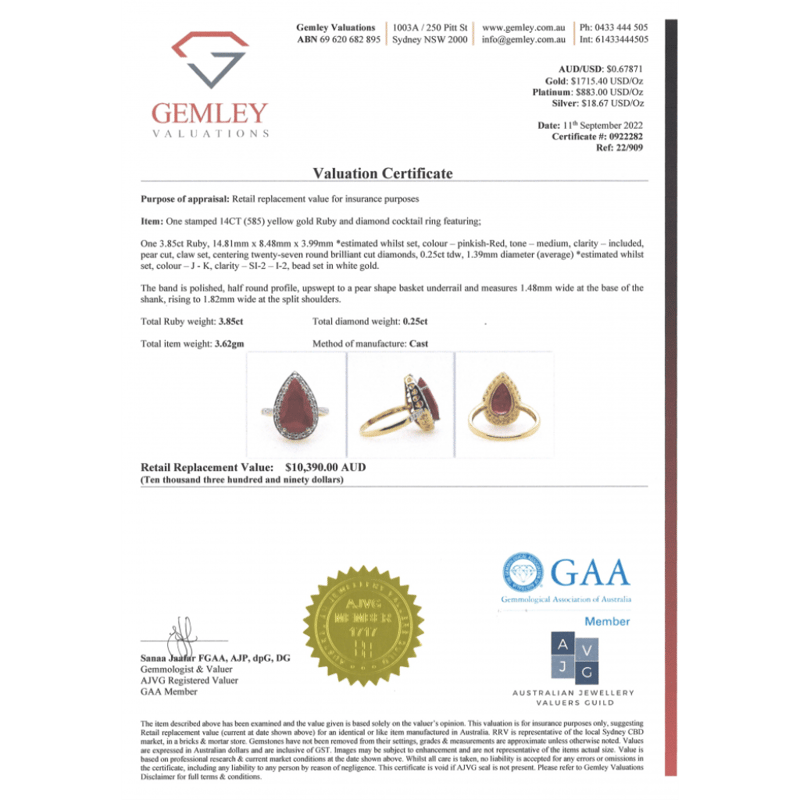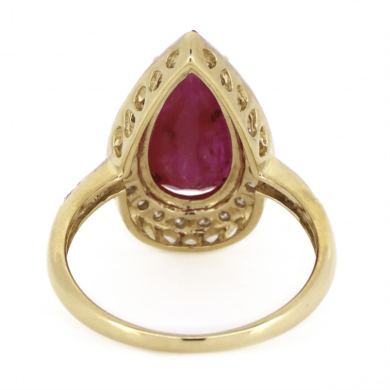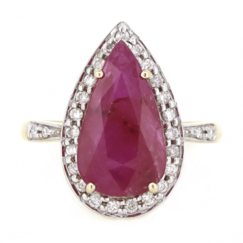 14K YELLOW GOLD, RUBY AND DIAMOND, HALO RING. The Centre Features, One Pear Faceted Cut, Pinkish-Red, Ruby (3.85Ct, Included), Claw Set. Surrounding The Centre In A Halo And Decorating The Band Are, 27 Round Brilliant Cut, Diamonds (0.25Ct Tdw, J-K Colour, Si2-I2 Clarity), Bead Set In White Gold. Ring Size N. 14K Yellow Gold, Ruby And Diamond, Halo Ring. The Centre Features, One Pear Faceted Cut, Pinkish-Red, Ruby (3.85Ct, Included), Claw Set. Surrounding The Centre In A Halo And Decorating The Band Are, 27 Round Brilliant Cut, Diamonds (0.25Ct Tdw, J-K Colour, Si2-I2 Clarity), Bead Set In White Gold. Ring Size N. Jewellery Valuations Provided By A Third Party Professional Not Directly Associated With Lloyds Auctions at AUD $10,390.00This Insurance Valuation has been provided by a registered Jewellery Valuer and is intended for insurance purposes only. The valuation amount has no bearing on the auction value of the item. Any questions regarding the valuation should be directed to the issuing Valuer (refer to contact details on the certificate) as Lloyds have no association or relationship with the Valuer or the valuation amount contained within the valuation. Condition: NEW 0584876+1434