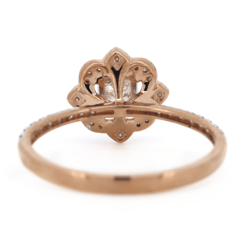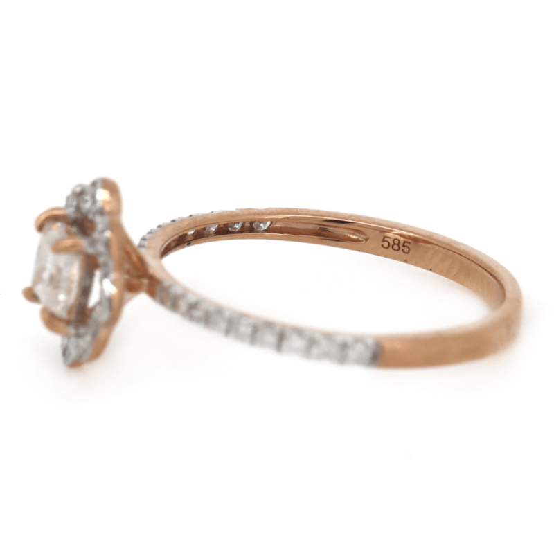 14K ROSE GOLD AND DIAMOND, RING. The Centre Features, One Princess Cut, Diamond (0.38Ct, K-L Colour, P1-P2 Clarity ), 4 Claw Set. Surrounding The Centre In A Decorative Halo Are And Decorating The Band Are, 34 Round Brilliant Cut, Diamonds (0.22Ct Tdw, H-J Colour, Si2-P2 Clarity), Bead/Claw Set. Ring Size M 1/2. 14K Rose Gold And Diamond, Ring. The Centre Features, One Princess Cut, Diamond (0.38Ct, K-L Colour, P1-P2 Clarity ), 4 Claw Set. Surrounding The Centre In A Decorative Halo Are And Decorating The Band Are, 34 Round Brilliant Cut, Diamonds (0.22Ct Tdw, H-J Colour, Si2-P2 Clarity), Bead/Claw Set. Ring Size M 1/2. Jewellery Valuations Provided By A Third Party Professional Not Directly Associated With Lloyds Auctions at AUD $7,850.00This Insurance Valuation has been provided by a registered Jewellery Valuer and is intended for insurance purposes only. The valuation amount has no bearing on the auction value of the item. Any questions regarding the valuation should be directed to the issuing Valuer (refer to contact details on the certificate) as Lloyds have no association or relationship with the Valuer or the valuation amount contained within the valuation. Condition: NEW 0584876+1500