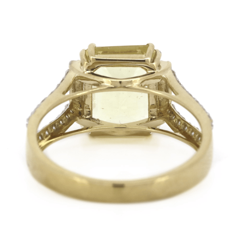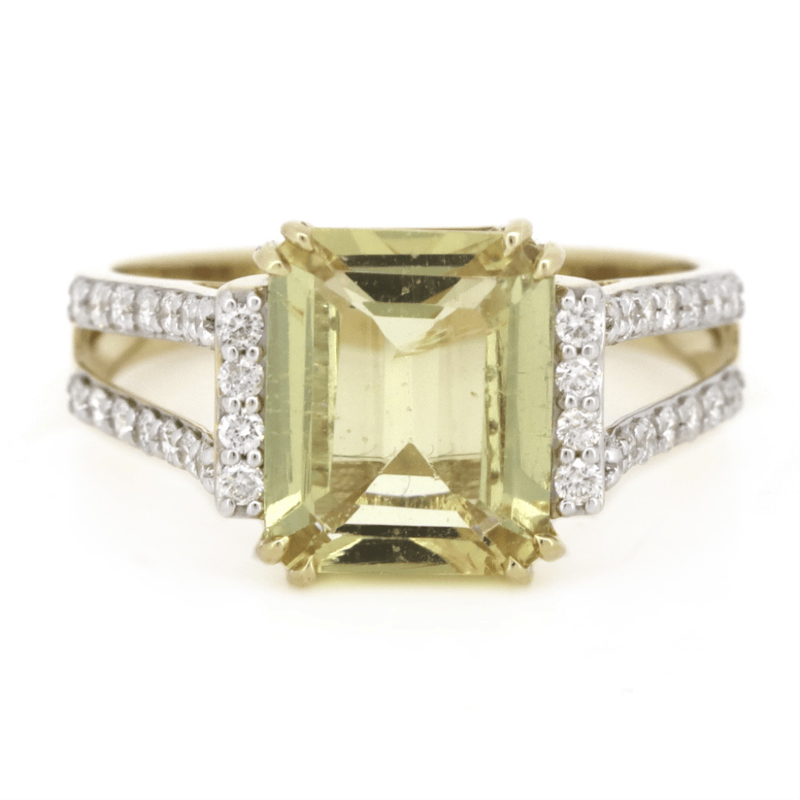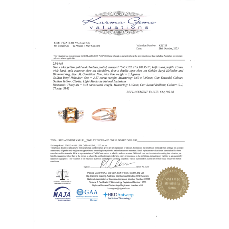14K YELLOW GOLD, HELIODOR AND DIAMOND, DRESS RING. The Centre Features, One Emerald Cut, Golden Yellow, Heliodor (2.27Ct, Light-Moderate Inclusions), Double 4 Claw Set. Embellishing The Design Are, 36 Round Brilliant Cut, Diamonds (0.35Ct Tdw, G-J Colour, Si-I2 Clarity), Micro-Bead Set In Yellow Gold. Ring Size M. Valuations Provided by an Independent Third-Party Professional Not Directly Associated With Lloyds Auctions at AUD $$12,100.00This valuation has been conducted by an independent third-party professional. The valuation amount is an assessment by the issuing valuer and does not reflect the auction value of the item. Any inquiries regarding the valuation should be directed to the issuing valuer (refer to contact details on the certificate), as Lloyds Auctions has no affiliation or influence over the valuation, the valuer, or the stated amount. Condition: Good - Refer Images 0645888+1335