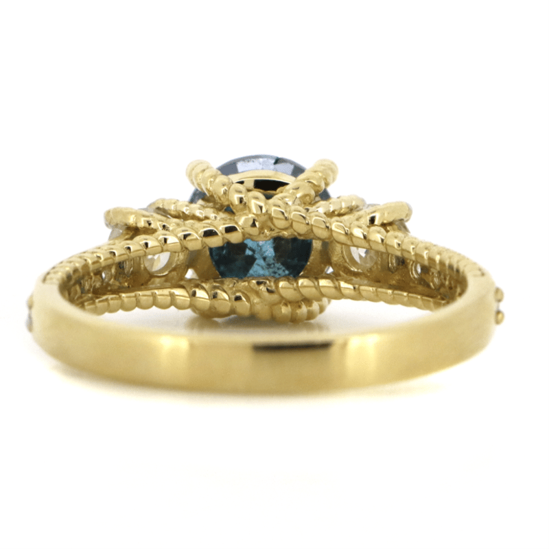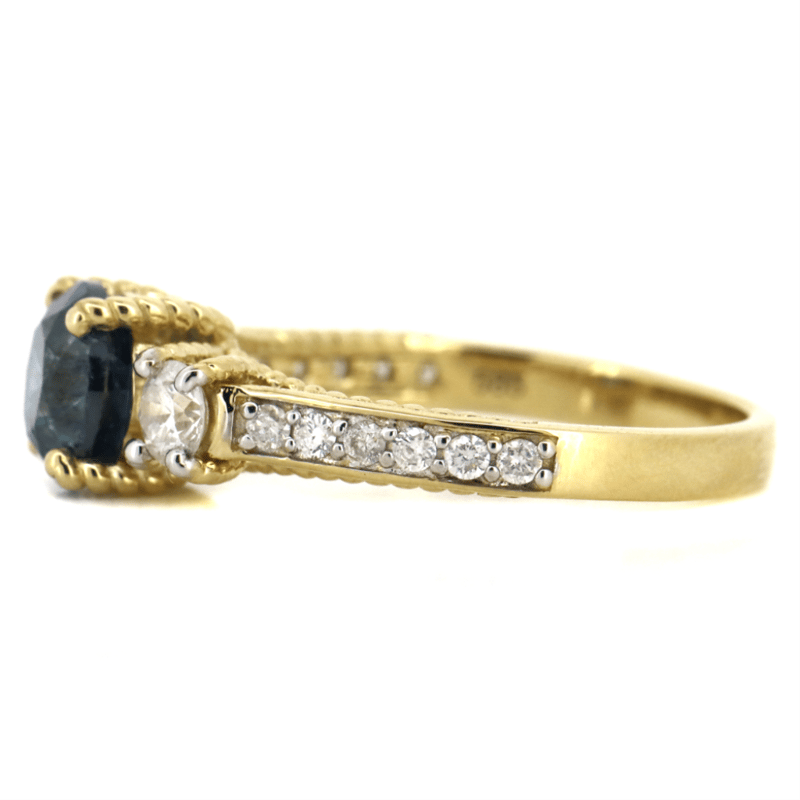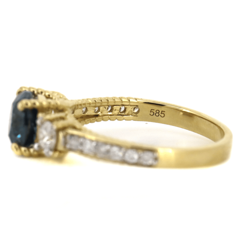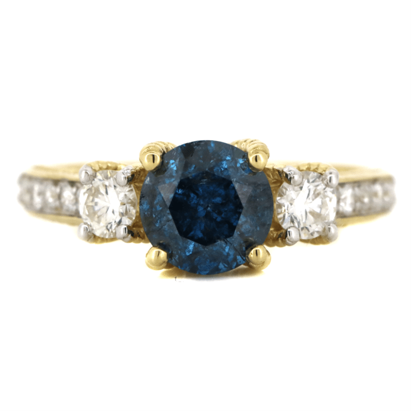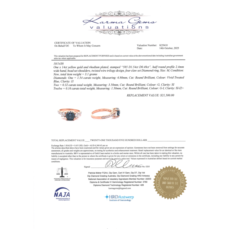 14K YELLOW GOLD, BLUE DIAMOND AND DIAMOND, TRILOGY RING. The Centre Features, One Round Brilliant Cut, Blue Diamond (1.54Ct,I1 Clarity, Treated), 4 Claw Set. Flanking The Centre Are, 2 Round Brilliant Cut, Diamonds (0.32Ct Tdw, G Colour, Si Clarity), 4 Claw Set. Decorating The Band Are, 12 Round Brilliant Cut, Diamonds (0.16Ct Tdw, G-I Colour, Si-I2+ Clarity), Bead Set. Ring Size M. Valuations Provided by an Independent Third-Party Professional Not Directly Associated With Lloyds Auctions at AUD $$21,500.00This valuation has been conducted by an independent third-party professional. The valuation amount is an assessment by the issuing valuer and does not reflect the auction value of the item. Any inquiries regarding the valuation should be directed to the issuing valuer (refer to contact details on the certificate), as Lloyds Auctions has no affiliation or influence over the valuation, the valuer, or the stated amount. Condition: Good - Refer Images 0645888+1322