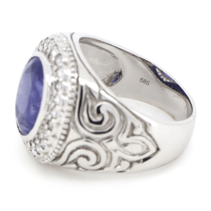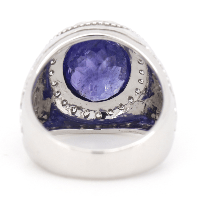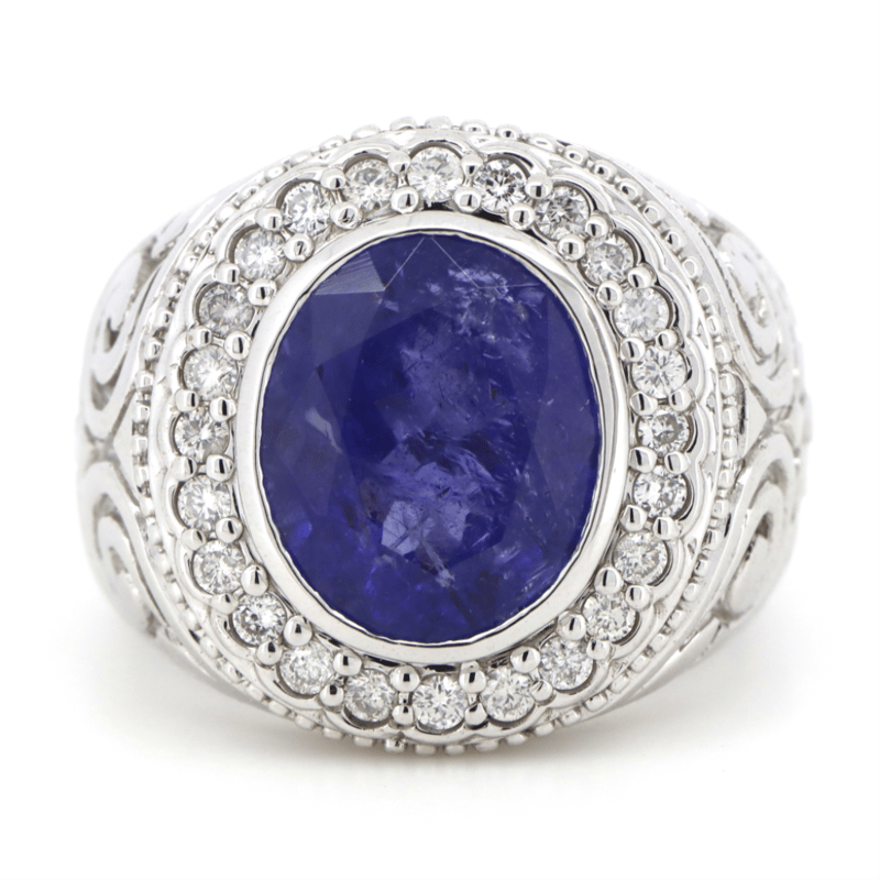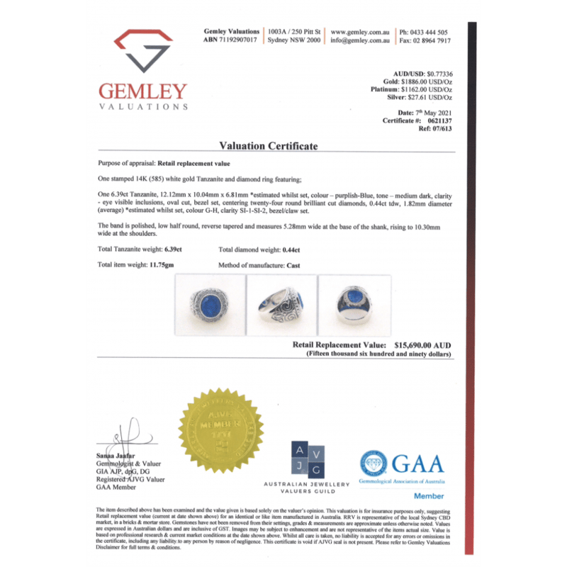 14K WHITE GOLD, 6.39CT TANZANITE AND DIAMOND, GENTS STATEMENT RING. The Centre Features, One Oval Cut, Medium Dark Purplish-Blue, Tanzanite (6.39Ct, Eye Visible Inclusions), Bezel Set. Surrounding The Centre In Halo Are, 24 Round Brilliant Cut, Diamonds (0.44Ct Tdw, G-H Colour, Si1-Si2 Clarity), Bezel/Claw Set. The Ring Band Is Decorated With A Bold Filigree Design. Ring Size Q 1/2. Valuations Provided by an Independent Third-Party Professional Not Directly Associated With Lloyds Auctions at AUD $$15,690.00This valuation has been conducted by an independent third-party professional. The valuation amount is an assessment by the issuing valuer and does not reflect the auction value of the item. Any inquiries regarding the valuation should be directed to the issuing valuer (refer to contact details on the certificate), as Lloyds Auctions has no affiliation or influence over the valuation, the valuer, or the stated amount. Condition: Good - Refer Images 0645888+1353