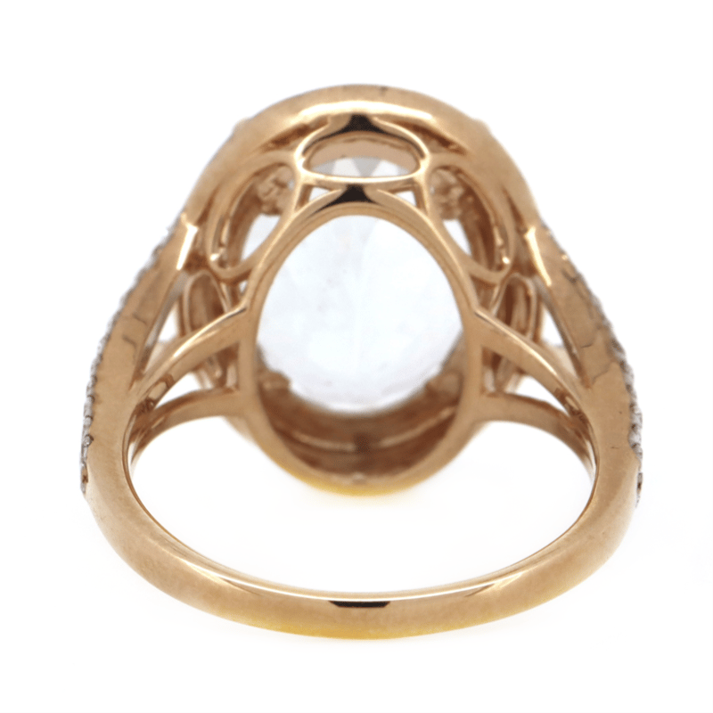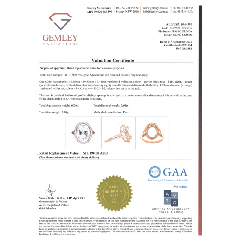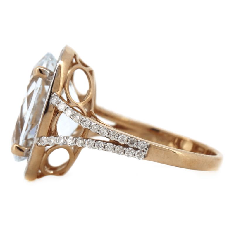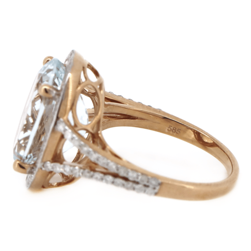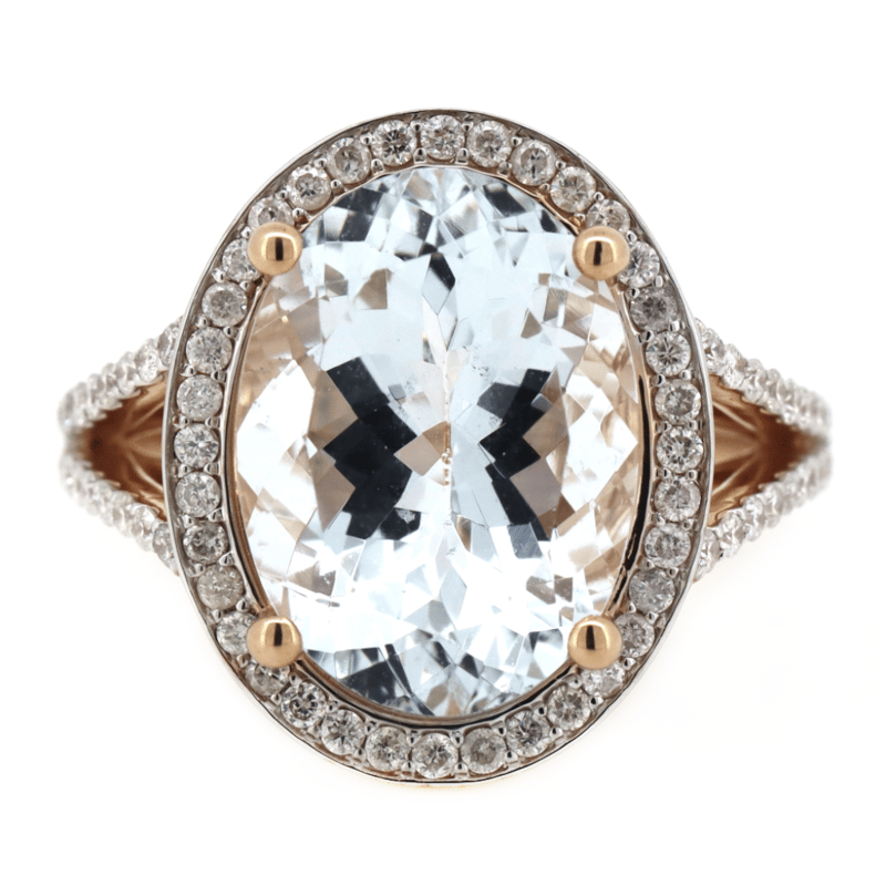 14K ROSE/WHITE GOLD, AQUAMARINE AND DIAMOND, STATEMENT RING. The Centre Features, One Oval Cut, Light Greyish-Blue, Aquamarine (6.24Ct, Minor Eye Visible Inclusions), Claw Set. Surrounding The Centre In A Halo And Decorating The Split Band Are, 80 Round Brilliant Cut, Diamonds (0.60Ct Tdw, J-K Colour, Si2-I2 Clarity), Micro-Claw Set In White Gold. Ring Size N. Condition: New. Valuations Provided by an Independent Third-Party Professional Not Directly Associated With Lloyds Auctions at AUD $$10,190.00This valuation has been conducted by an independent third-party professional. The valuation amount is an assessment by the issuing valuer and does not reflect the auction value of the item. Any inquiries regarding the valuation should be directed to the issuing valuer (refer to contact details on the certificate), as Lloyds Auctions has no affiliation or influence over the valuation, the valuer, or the stated amount. Condition: Good - Refer Images 0645888+1379